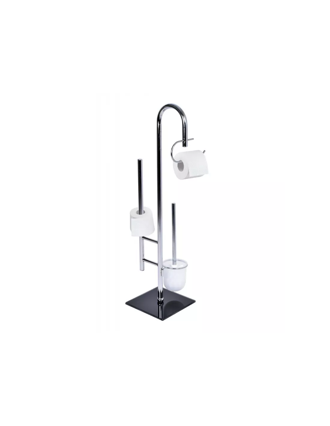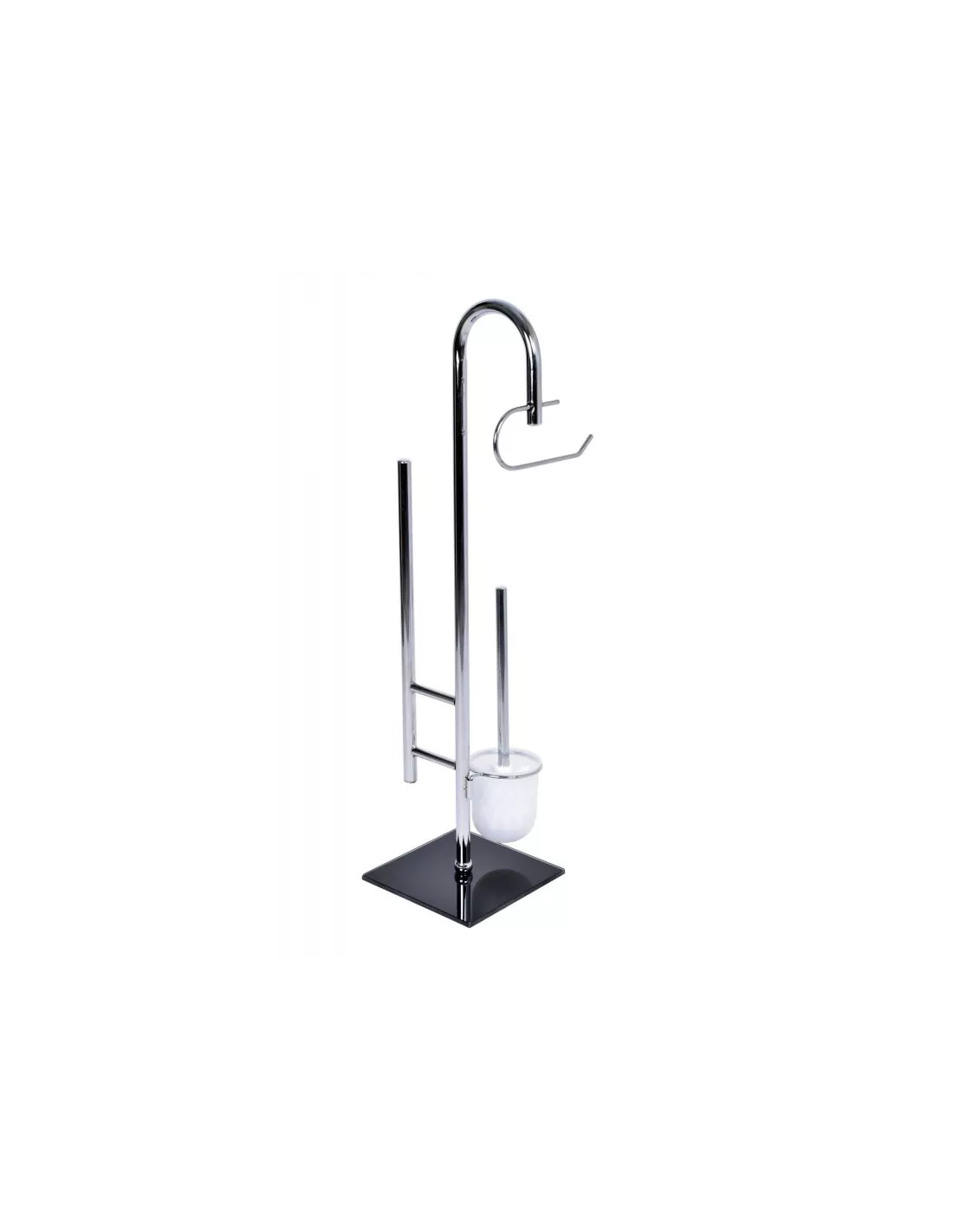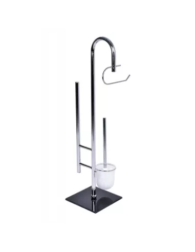 Elegant to praktyczny stojak łazienkowy, wolnostojący. Stojak ze zintegrowanymi uchwytami na papier toaletowy oraz szczotkę WC z wyjmowanym pojemnikiem. Stojak łazienkowy Elegant wyposażony jest w dodatkowy słupek na zapasowy papier. Estetyczna i stabilna konstrukcja z podstawką ze szkła hartowanego w kolorze czarnym. Elegancki i funkcjonalny odnajdzie się świetnie w każdej łazience.