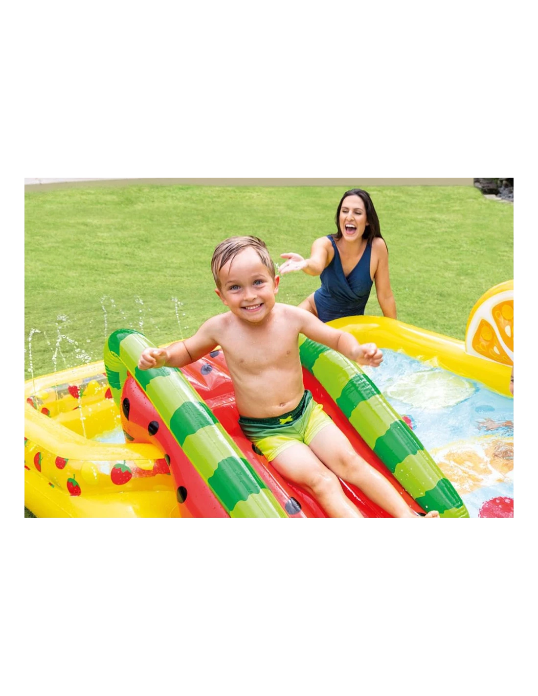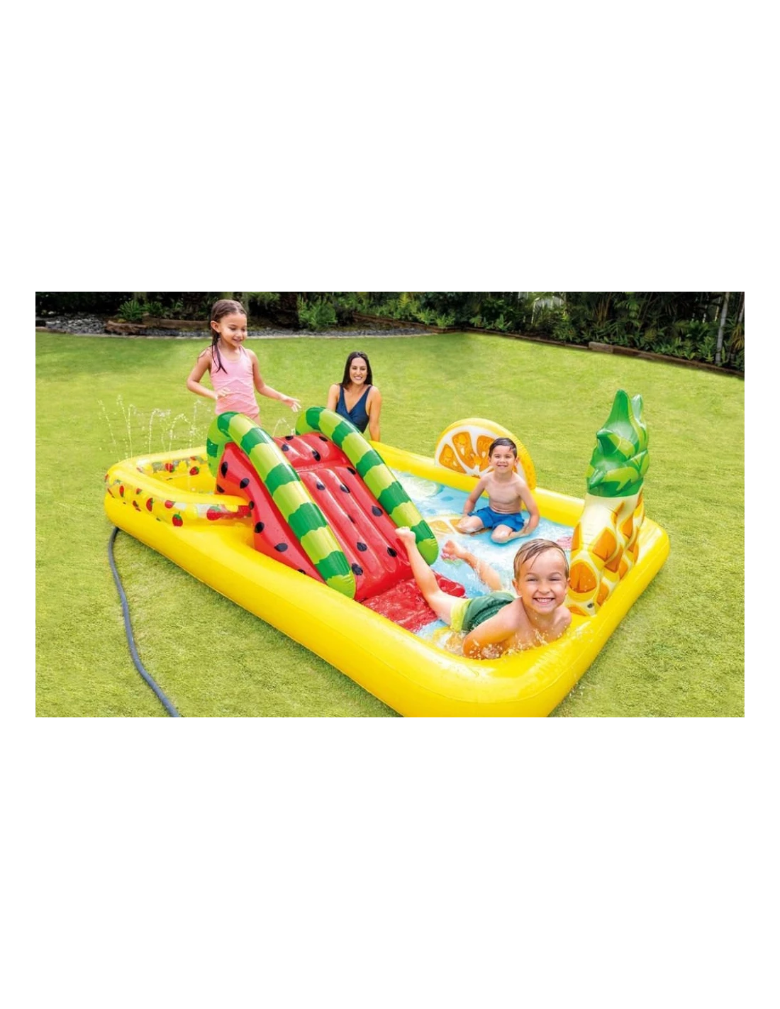 Basen ogrodowy to jedna z pozycji obowiązkowych w ogrodzie w czasie letnim. Gdy z nieba leje się żar, chętnie sięgamy po wszystko, co może przynieść odrobinę chłodu. Basen dmuchany, który jednocześnie stanie się placem zabaw dla dzieci zapewni dodatkowo także frajdę i dużo dobrej zabawy! Model Owocowe Party - wyposażony jest w wiele atrakcji, które kochają dzieci! Dmuchana zjeżdżalnia, miękkie lądowisko a nawet wodna fontanna i dmuchane owoce! Wszystko ubrane w przyjemny, bajkowy motyw, bliski każdemu dziecku. A jakie z niego korzyści dla rodziców? Raz nadmuchany służy przez wiele dni, wytrzymałe tworzywo, z jakiego jest wykonany zapewnia bezpieczeństwo użytkowana, bez obaw o przedarcia no i przede wszystkim - chwila spokoju...