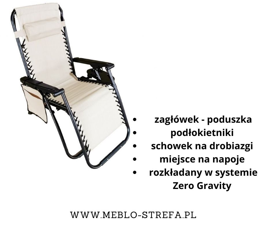 Doskonała propozycja dla osób lubiących mieć wszystko w zasięgu ręki. W schowku zmieści się zarówno książka jak i telefon. Uchwyty na napoje i zimne drinki, sprawią, że nie trzeba będzie co chwilę wstawać, by się napić. Dodatkowy atut tego leżaka to system rozkładania leżak zero gravity – całość odchyla się w tył, dzięki czemu leżakujemy jeszcze bardziej na leżąco .