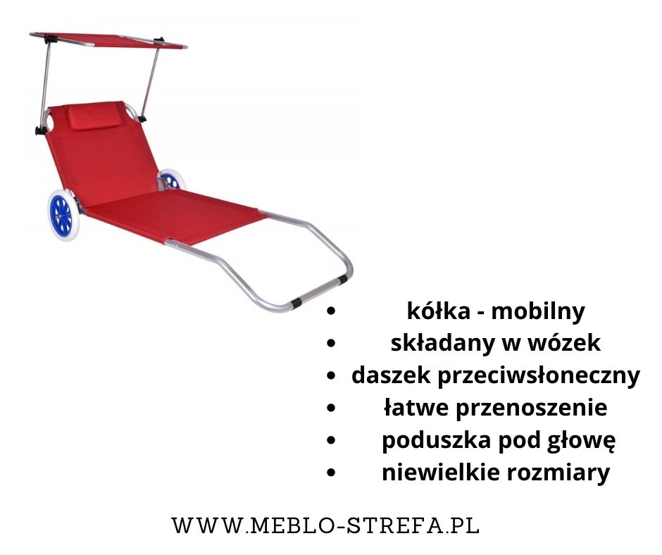 Niewielki rozmiarami ale funkcjonalny leżak na kółkach to propozycja przede wszystkim dla tych, którzy nie lubią dźwigać leżaka pod pachą brodząc przez piach. Leżak z kółkami składany w wózek możesz ciągnąć za sobą niczym walizkę. To nie lada ułatwienie. Dodatkowe jego atuty to poduszka pod głowę i daszek którym osłonisz głowę od nadmiaru słońca. Świetna propozycja dla osób poszukujących leżaka typowo plażowego.