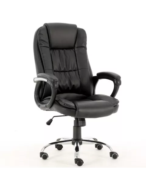 Fotel obrotowy wykonany z najwyższej jakości materiałów. Posiada piękną tapicerkę z eko -skóry (siedzisko, zagłówek i oparcie) a także wygodne tapicerowane podłokietniki z elementami chromowanego metalu. Podstawa jezdna wykonana została z polerowanego aluminium, które nie tylko jest wytrzymałe i odporne ale także pięknie się prezentuje.