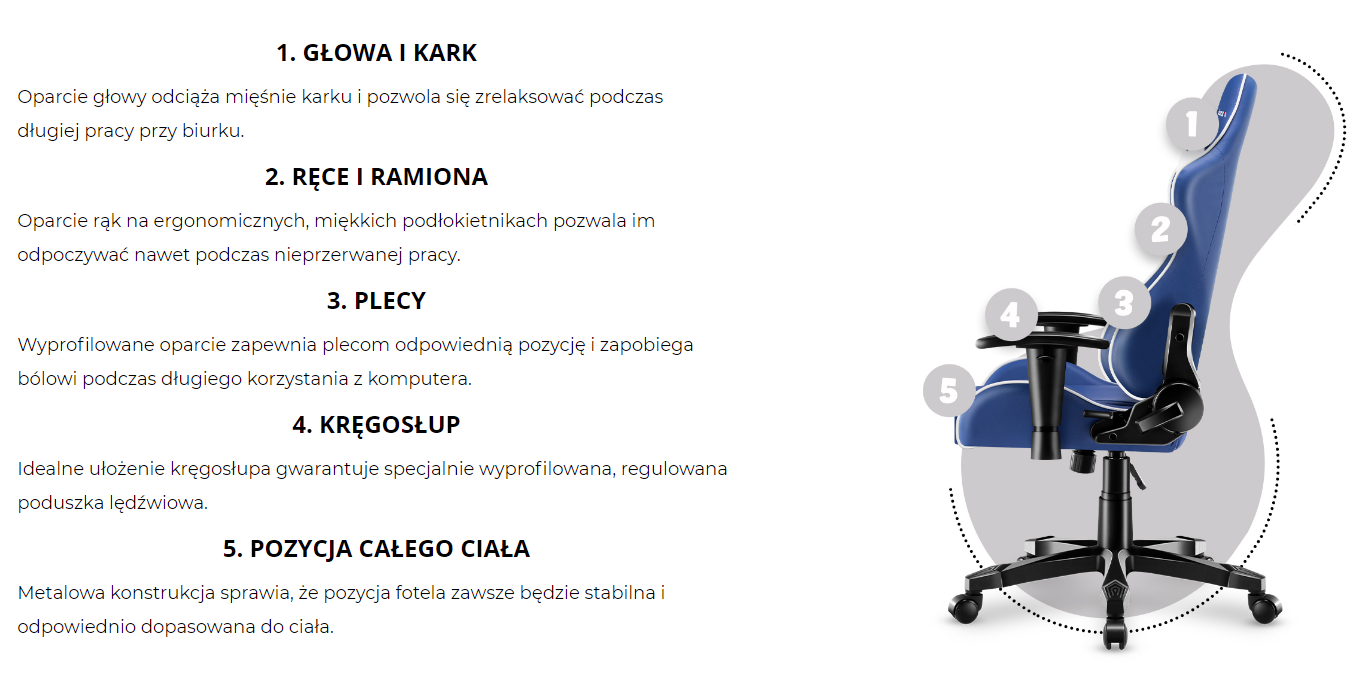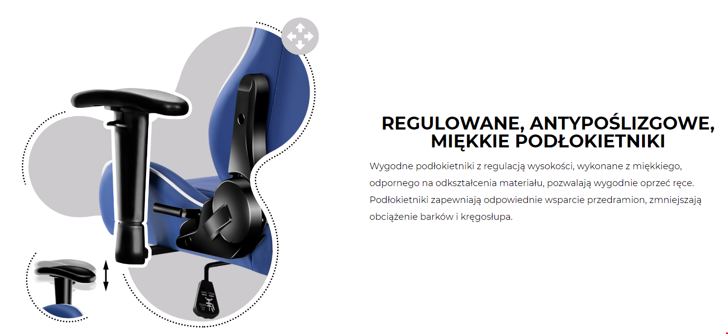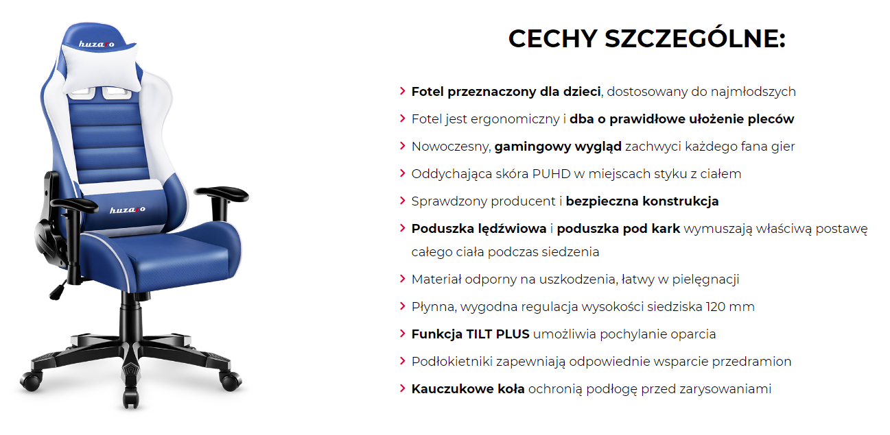 Fotel ten posiada praktycznie wszystkie obecne na rynku udogodnienia i funkcje. Fotel dziecięcy obrotowy wyposażony jest w amortyzator gazowy, mechanizm Tilt Plus, mechanizm Cradle z regulacją siły oparcia i możliwość blokady, zagłówek, poduszka lędźwiowa, miękkie podłokietniki z wielostopniową regulacją. Wszystkie te udogodnienia sprawiają, że nawet wielogodzinna praca/gra przy biurku nie stanowi obciążenia dla kręgosłupa dziecka. Oparcie idealnie obejmuje plecy i zapewnia kręgosłupowi odpowiednią pozycję od kręgów szyjnych, aż po lędźwia.