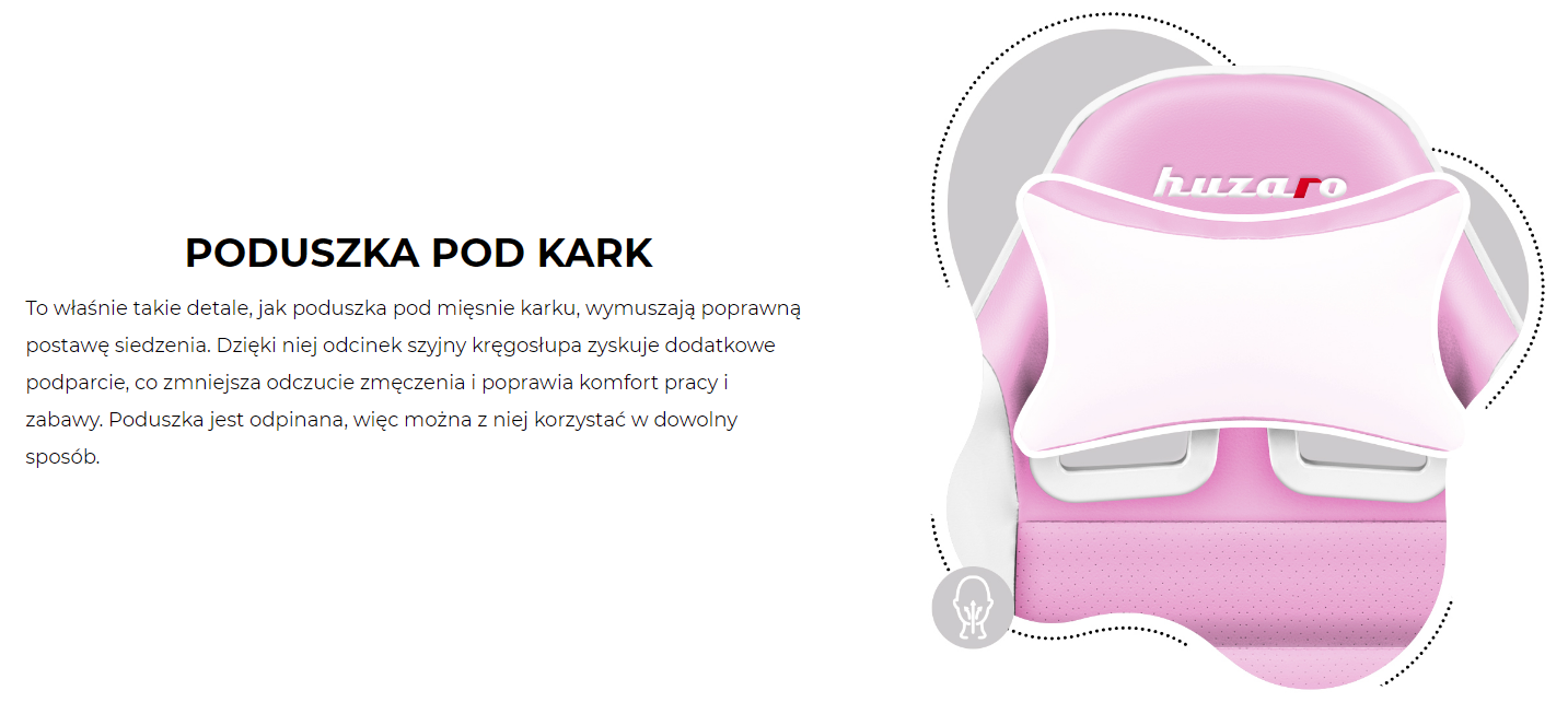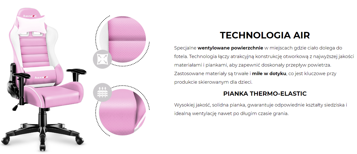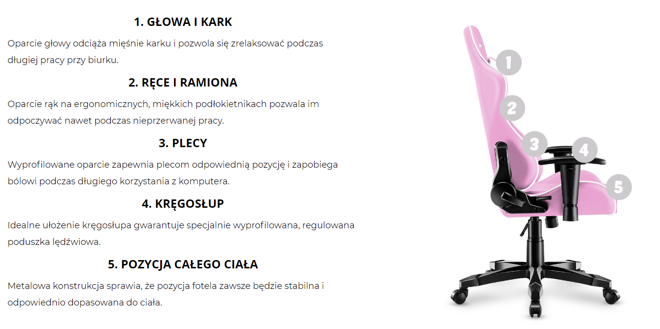 Fotel ten posiada praktycznie wszystkie obecne na rynku udogodnienia i funkcje. Fotel dziecięcy obrotowy wyposażony jest w amortyzator gazowy, mechanizm Tilt Plus, mechanizm Cradle z regulacją siły oparcia i możliwość blokady, zagłówek, poduszka lędźwiowa, miękkie podłokietniki z wielostopniową regulacją. Wszystkie te udogodnienia sprawiają, że nawet wielogodzinna praca/gra przy biurku nie stanowi obciążenia dla kręgosłupa dziecka. Oparcie idealnie obejmuje plecy i zapewnia kręgosłupowi odpowiednią pozycję od kręgów szyjnych, aż po lędźwia.