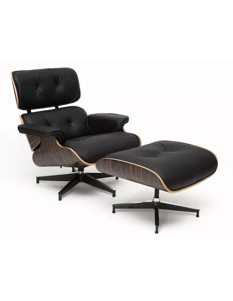 Fotel skórzany Vip w zestawie z podnóżkiem wykonany został z najwyższej jakości materiałów. Posiada piękną czarną tapicerkę z wysokogatunkowej skóry naturalnej, ozdobnie pikowaną a także wygodne podłokietniki (również tapicerowane). Wyprofilowane oparcie i wygodne miękkie siedzisko pozwalają na wielogodzinny relaks. Podstawa wykonana została z polerowanego aluminium (boki i spód nóg lakierowane na czarno a wierzch polerowany), które nie tylko jest wytrzymałe i odporne ale także pięknie się prezentuje. Swoją oryginalność fotel zawdzięcza połączeniu fornirowanych, sklejkowych elementów, łączonych ze sobą metalowymi elementami.