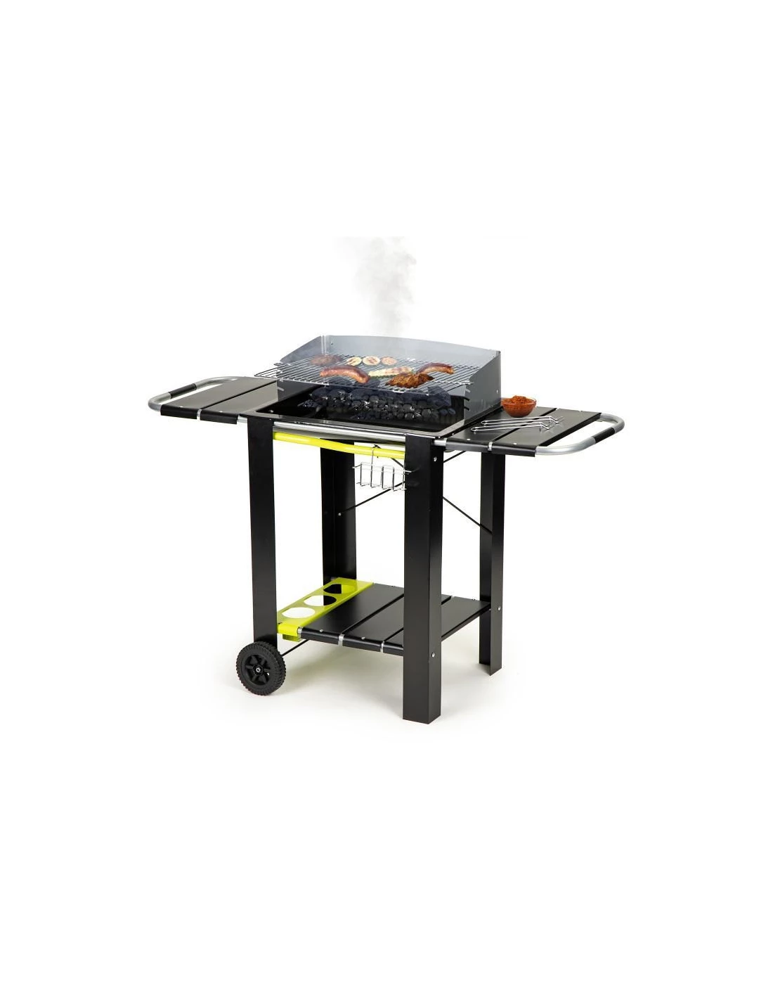 Grill posiada 3 funkcjonalne półki: dwie z nich znajdują się przy ruszcie, w razie potrzeby można na nie odłożyć potrawy lub przybory. Trzecia mieści się pod spodem, przyda się np. na odłożenie worka z węglem. Grill wyposażony jest także w metalowy koszyczek na przyprawy, zakończony haczykami, na które odwiesić można narzędzia do grillowania. Dwa kółka umożliwiają szybkie i łatwe przemieszczanie, bez konieczności podnoszenia całości. Nietypowe połączenie kolorystyczne czerni z jaskrawą żółcią to nowoczesny design, który idealnie wpisze się w każdy przydomowy ogródek.