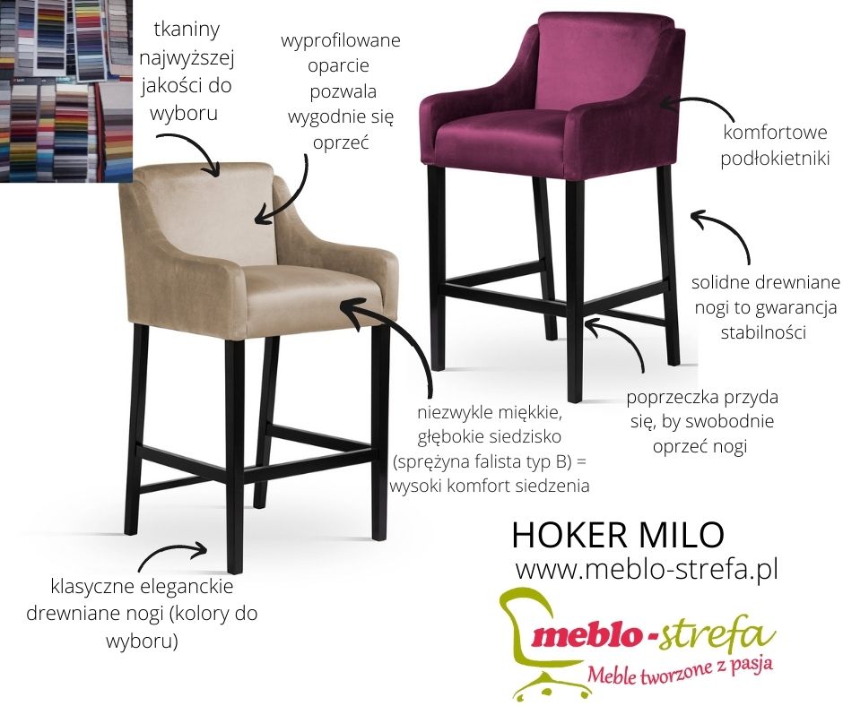 Krzesło barowe, hoker tapicerowany Milo to piękny, stylizowany mebel, który idealnie odnajdzie się w każdym ekskluzywnym pomieszczeniu. Nada klasy i stylu w eleganckim barze, zapewni komfort siedzenia w kuchni. Tak samo dobrze wygląda powtórzone w kliku sztukach przy barowym blacie jak i jako pojedynczy mebel. Szerokie, miękkie siedzisko gwarantuje wygodę siedzenia. Hokery Milo to klasa, styl i luksus - zarezerwowane dla Ciebie!
