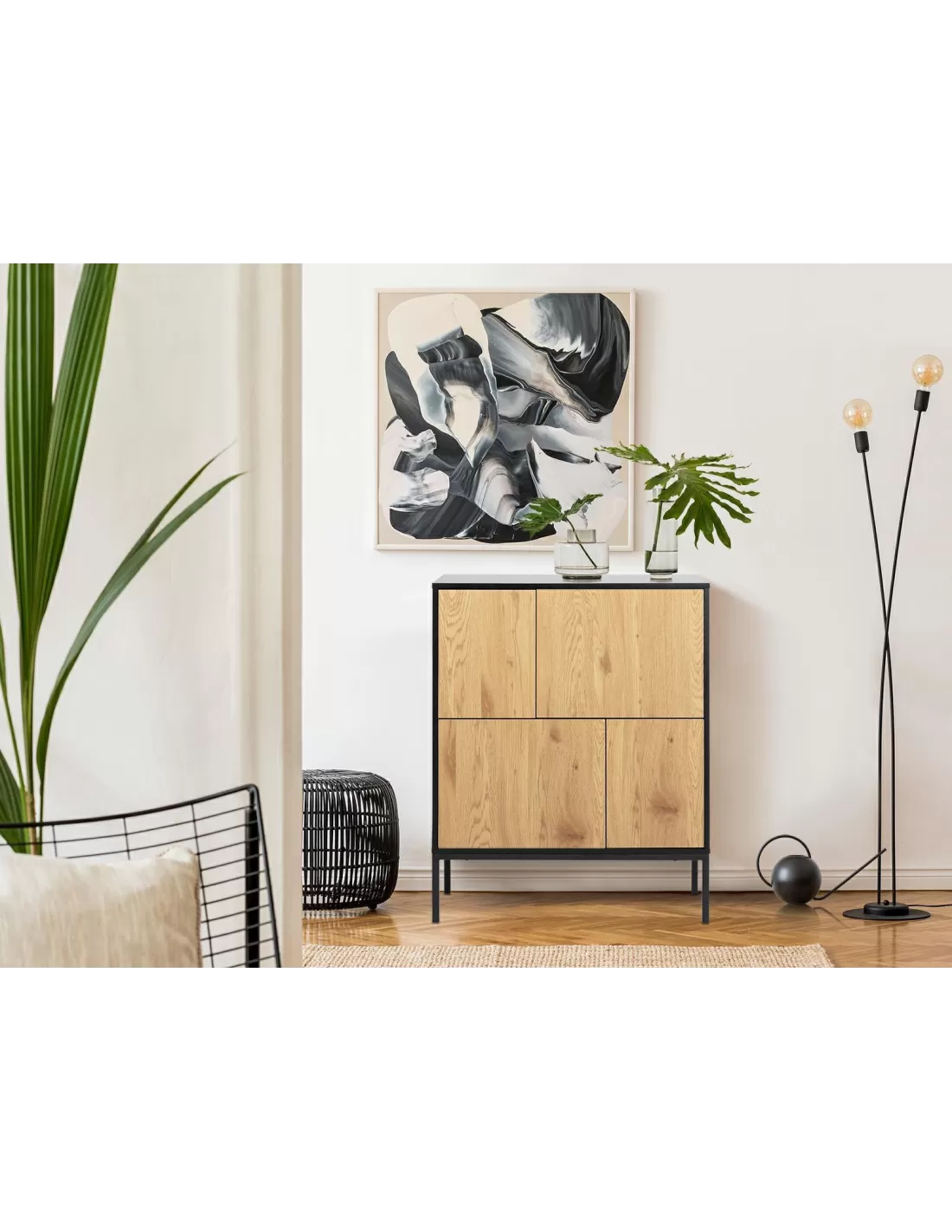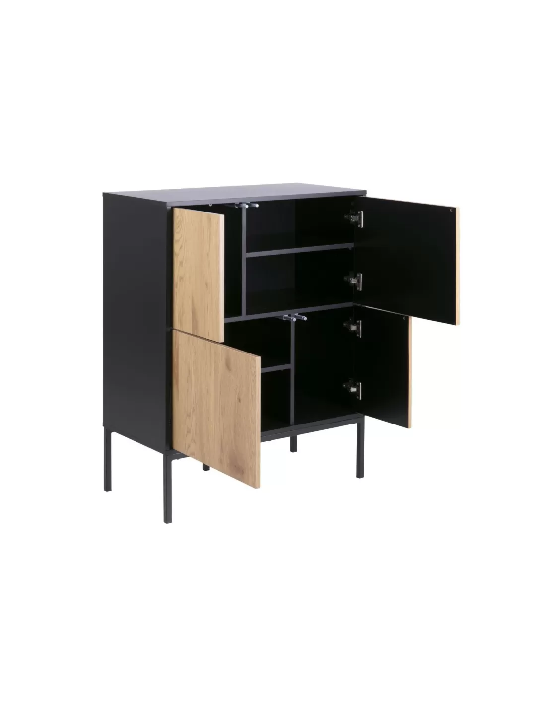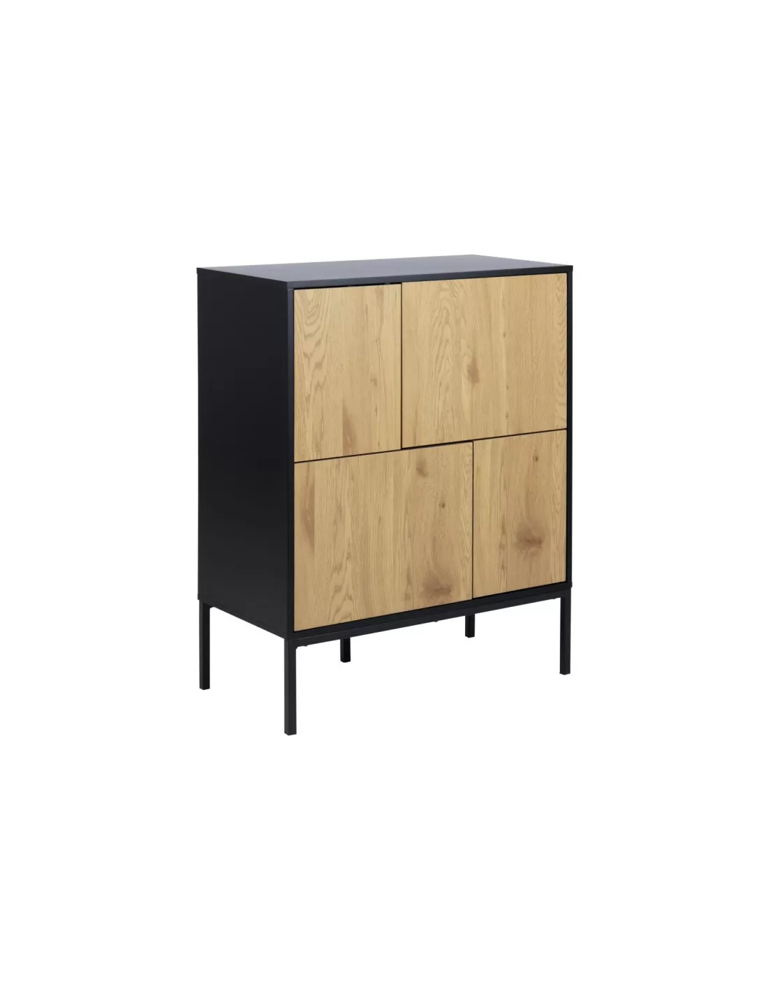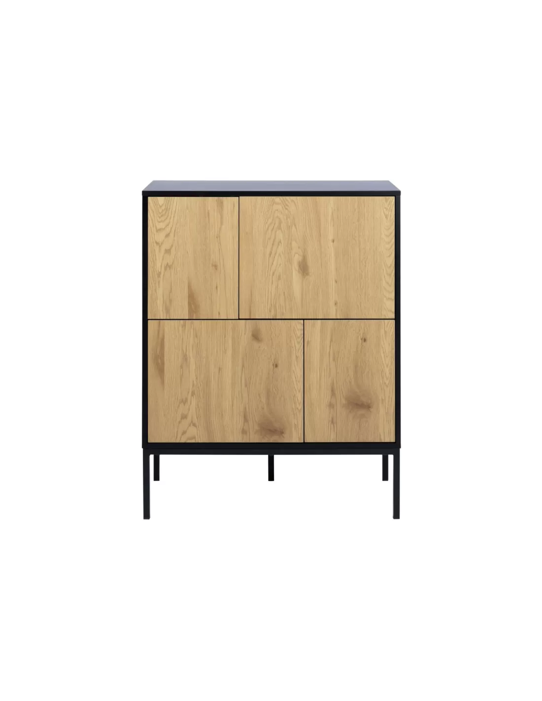 Seaford to model, który zaskakuje swoją prostotą i funkcjonalnością w połączeniu z modnym designem. 4 fronty bezuchwytowe, skrywają łącznie 6pojemnych półek, które pomieszczą co tylko zechcesz począwszy od dokumentów przez odzież po naczynia. Ten wielofunkcyjny mebel znajdzie zatem zastosowanie zarówno w domowym salonie, sypialni jak i biurze czy gabinecie - wszędzie tam, gdzie liczy się funkcjonalność i design. Naturalny dąb frontów z uwidocznionymi słojami i strukturą idealnie komponuje się z czernią korpusu, który wspiera się na 4 solidnych metalowych nóżkach. Zabieg ten nadał z pozoru "topornej" konstrukcji niezwykłej lekkości. Komoda zyskała także na funkcjonalności - nie trzeba schylać się do ziemi chcąc coś wyjąć lub włożyć, z łatwością można pod nią posprzątać.