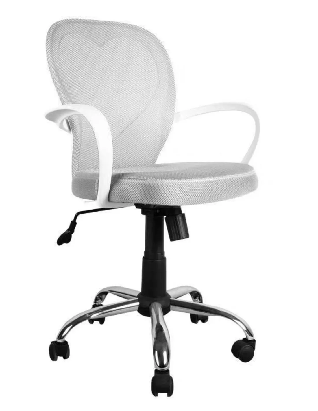 Fotel obrotowy QZY-1447 odnajdzie się z pewnością w każdym pokoju dziecka, a zwłaszcza dziewczynki. QZY-1447 cechuje się wysoką estetyką i dbałością o detale wykonania. Wyposażony jest w teleskop pneumatyczny, dzięki któremu można swobodnie regulować wysokość, tak by dopasować ją do wzrostu dziecka; Fotelik dziecięcy posiada również regulację odchylania w tył. Chromowany stelaż typu krzyżak nie tylko zapewnia całej konstrukcji stabilność ale także idealnie współgra ze srebrną tapicerką. Materiał z jakiego zostało wykonane oparcie i siedzisko to tkanina membranowa wysokiej jakości - gwarantuje ona swobodny przepływ powietrza między oparciem a pleckami dziecka. W oparciu zastosowano bardzo dziewczęcy motyw serduszka. Piękny srebrzysty kolor tapicerki.... i każda Mała Księżniczka jest zadowolona!