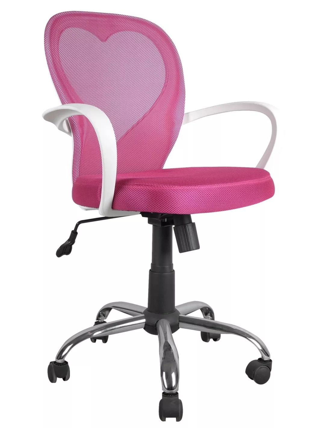 Fotel obrotowy QZY-1447 odnajdzie się z pewnością w każdym pokoju dziecka, a zwłaszcza dziewczynki. QZY-1447 cechuje się wysoką estetyką i dbałością o detale wykonania. Wyposażony jest w teleskop pneumatyczny, dzięki któremu można swobodnie regulować wysokość, tak by dopasować ją do wzrostu dziecka. Fotelik dziecięcy posiada również regulację odchylania w tył. Solidny chromowany stelaż typu krzyżak. Materiał z jakiego zostało wykonane oparcie i siedzisko to tkanina membranowa wysokiej jakości - gwarantuje ona swobodny przepływ powietrza między oparciem a pleckami dziecka. W oparciu zastosowano bardzo dziewczęcy motyw serduszka. Piękny różowy kolor tapicerki.... i każda Mała Księżniczka jest zadowolona!