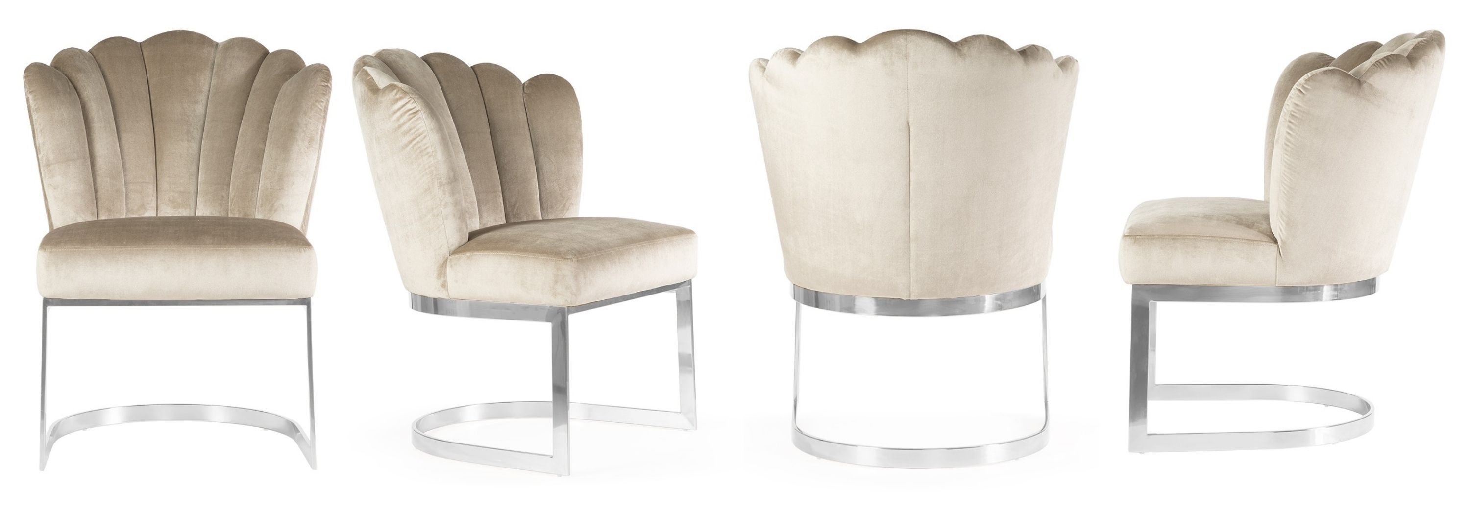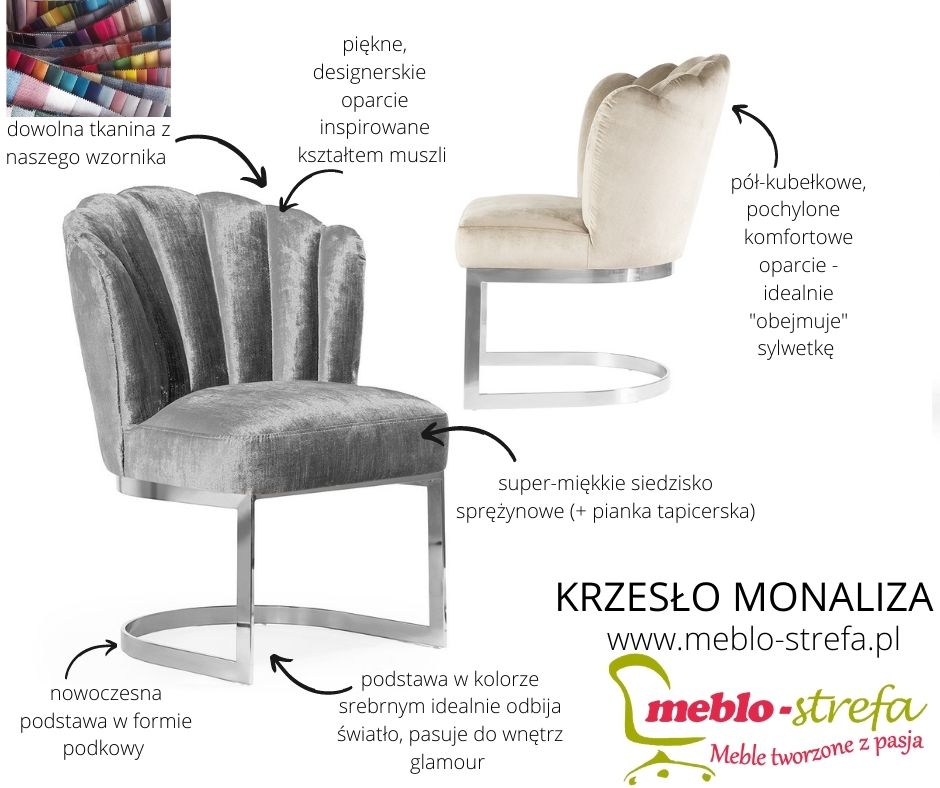 Krzesło Monaliza to utrzymany w stylistyce nowoczesnego glamour krzesło, które z pewnością przypadnie do gustu niejednej osobie. Już na pierwszy rzut oka uwagę przyciąga efektowne oparcie z ozdobnymi pinowymi przeszyciami - nawiązujące do kształtu muszli. Jego design przywodzi na myśl wnętrza pełne klasy, szyku i elegancji. Dodatkowy atut stanowi oryginalna podstawa w formie podkowy, dzięki zabiegowi chromowania - świetnie odbija kształty i promienie. Na krześle Monaliza rozsiądziesz się wygodnie niczym na królewskim tronie! Model ten z pewnością wprowadzi we wnętrza klasę i styl, będąc dodatkowo istotnym elementem wystroju.
