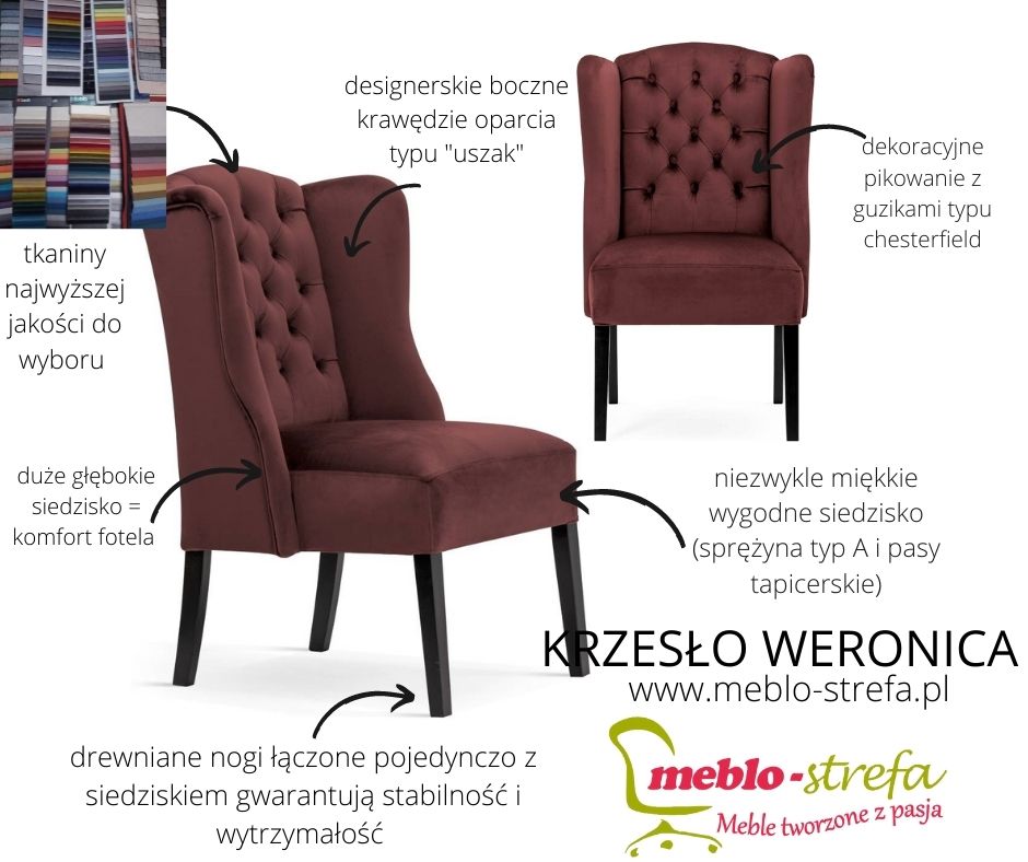 Weronica to nowość na polskim rynku meblowym, która szybko zdobyła sobie rzeszę fanów. Przyciąga już sam design. Siedzisko krzesła nawiązuje swoją formą do siedziska, jakie często widujemy w przypadku foteli wypoczynkowych. Finezyjnie pogłębione oparcie, dzięki wysuniętym "uszakowym" bokom i oczywiście ponadczasowe pikowania chesterfield. Uroku całości dodały z pewnością dekoracyjne guziki. Tak okazałe siedzisko wspiera się na delikatnych (na pozór) 4 drewnianych nogach. Całość ciekawie się ze sobą komponuje, dostarczając wielu wrażeń estetycznych. Choć jest godne królewskich sal, znakomicie odnajdzie się przy stole w Twojej jadalni lub w eleganckim hotelowym lobby.