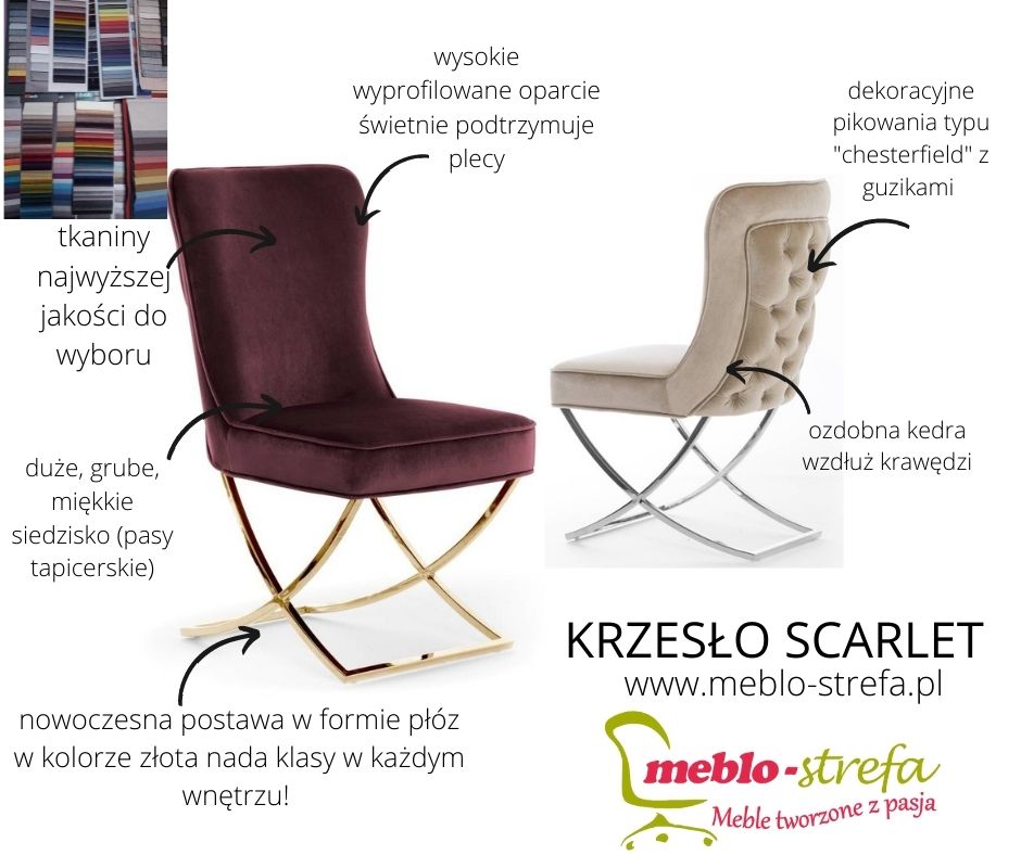 Scarlet to przede wszystkim, wygodne, komfortowe niczym w przypadku fotela siedzisko, które daje okazję do dłuższych posiedzeń przy stole w rodzinnym gronie i nie tylko. Wysokie, wyprofilowane oparcie pozwala swobodnie oprzeć całe plecy, a co za tym idzie daje podparcie dla kręgosłupa. Siedzisko - nieco szersze i głębsze niż w standardowych krzesłach, pozwala swobodnie rozsiąść się i cieszyć niezwykłą miękkością. Scarlet to modne, nowoczesne krzesło, z którego nie będziesz chciał(a) wstać!
