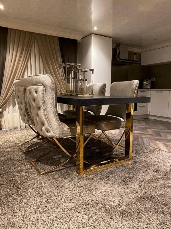 W przypadku krzesła Scarlet zastosowano niezwykle dekoracyjną formę oparcia, która przyciąga już od pierwszego spojrzenia. Wiecznie modne, klasyczne pikowanie typu chesterfield, wzbogacone o dekoracyjne guziki, wypada tutaj wyjątkowo korzystnie. Umieszczono je na tyle oparcia, dzięki czemu krzesło Scarlet pięknie prezentuje się dostawione do stołu. Dodatkowo krawędzie siedziska i oparcia wykończono kedrą, co znacznie podnosi estetykę całości. Siedzisko wspiera się na niespotykanej podstawie w formie dwóch płóz, designersko wyginanych. Podstawa w kolorze złotym zapewnia niesamowite efekty wizualne - idealne odbijanie światła. Design krzesła Scarlet pretenduje je do do wnętrz w stylu nowojorskim, nowoczesnym, glamour, minimalistycznym...
