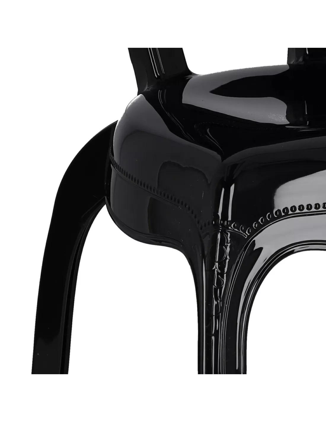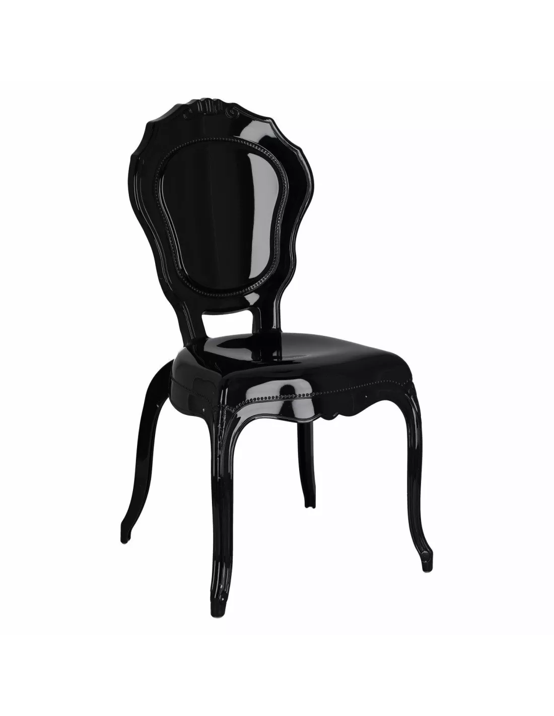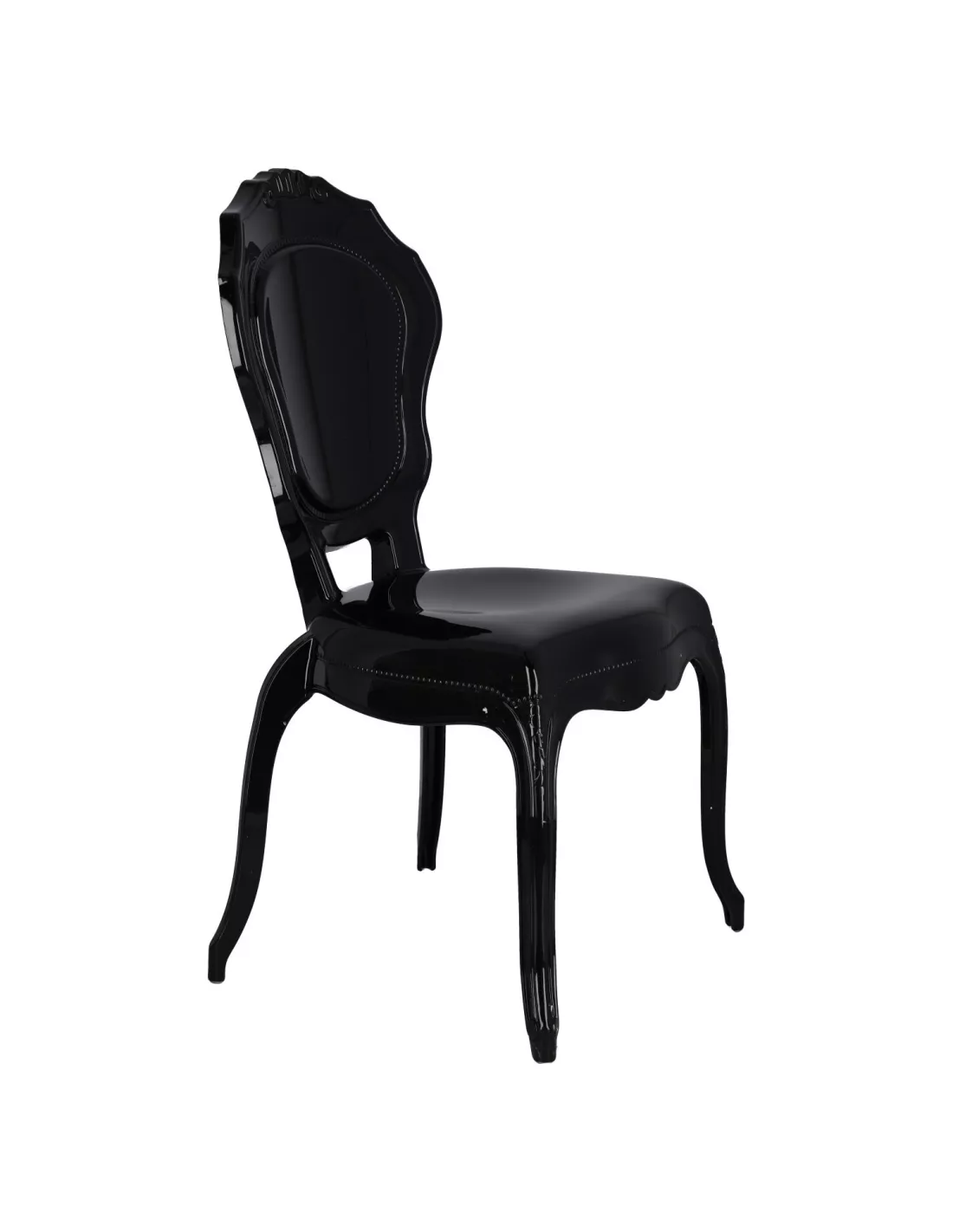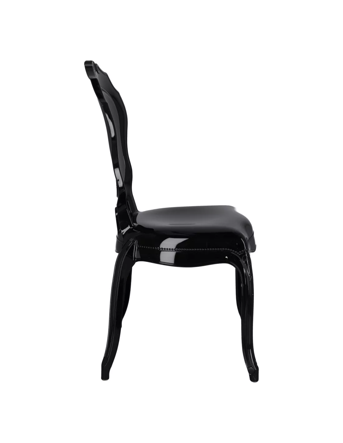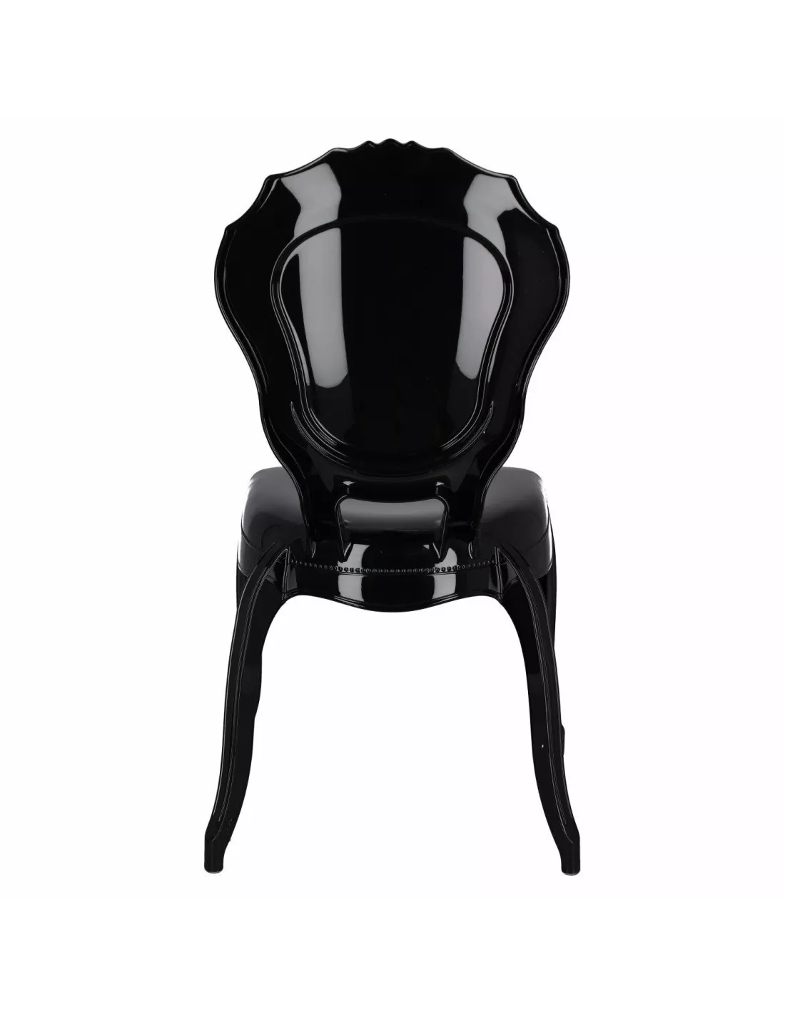 Elegancja, styl i design zamknięte w użytkowej formie - poznaj krzesło Queen i zakochaj się w stylistyce glamour elegance! To modne czarne krzesło nada klasy w niejednym pomieszczeniu domowym jak kuchnia, jadalnia, salon ale również w wszelkiego rodzaju lokalach usługowych typu restauracje, kawiarnie, salony piękności. Wykonane zostało z bardzo trwałego i odpornego materiału jakim jest poliwęglan, bez problemu wytrzyma nawet nacisk 140 kg!!! Krzesło Queen jest stabilne, nie chwieje się i nie przewraca, bardzo łatwe w utrzymaniu czystości - wystarczy przetrzeć ściereczką - a dzięki połyskowi naprawdę pięknie się prezentuje. Warto także zwrócić uwagę na wyprofilowane oparcie z dekoracyjnymi wzorami oraz finezyjnie lekko wygięte nogi. Od Ciebie zależy czy ustawisz je powtórzone w kilku sztukach przy stole w jadalni, czy jako pojedynczy element - ozdobę wnętrza. To właśnie połączenie designu i funkcjonalności zyskało już wielu amatorów na całym świecie.