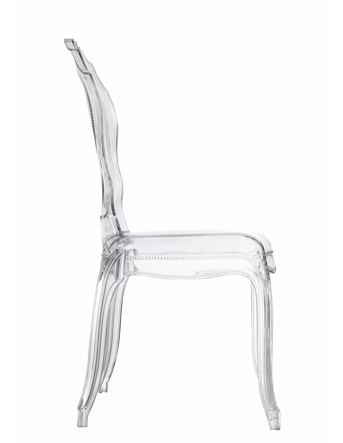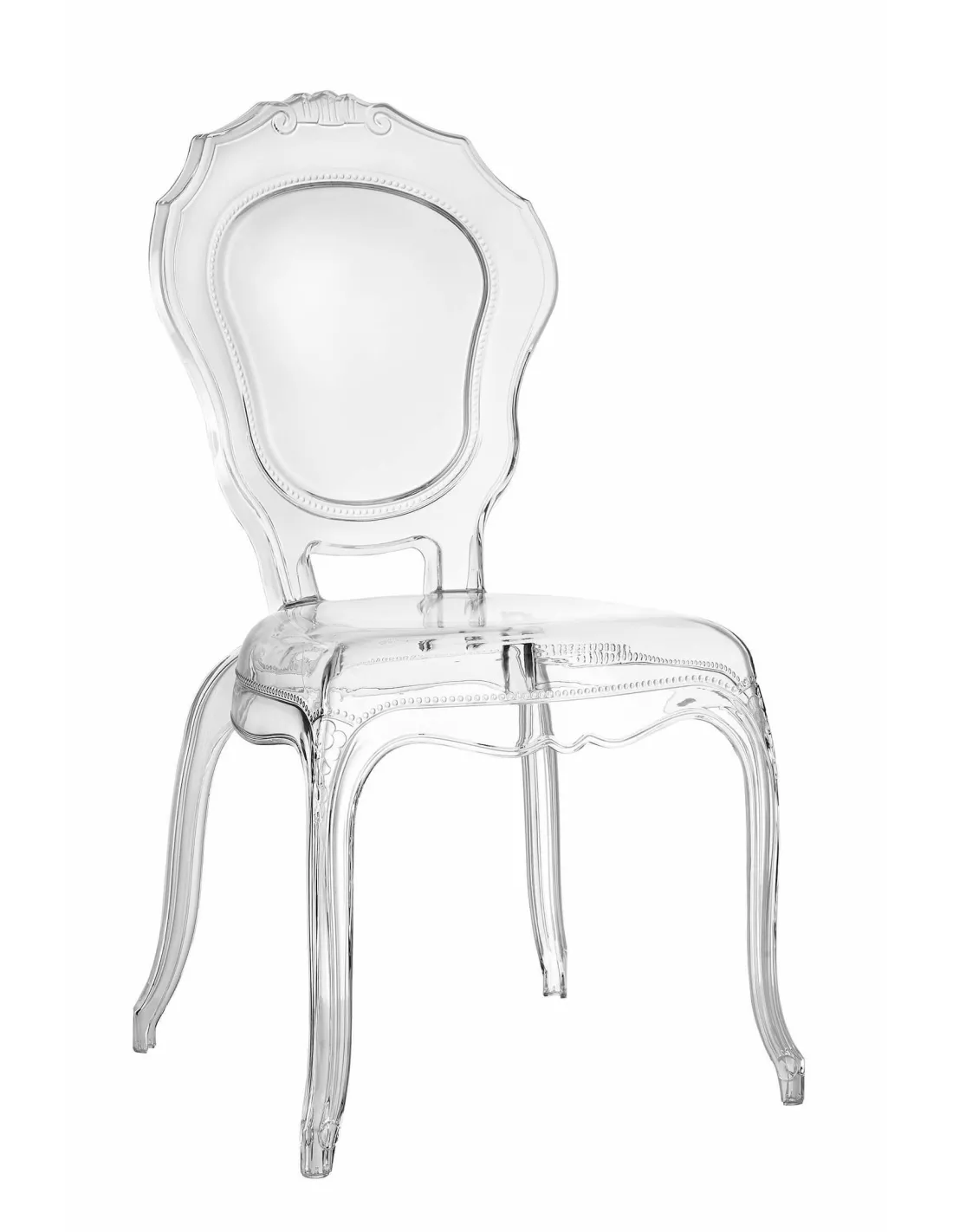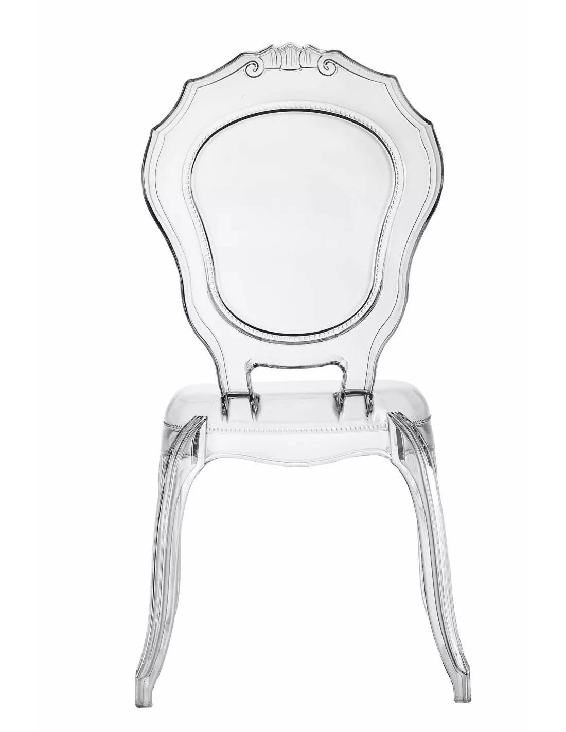 Elegancja, styl i design zamknięte w transparentnej użytkowej formie - poznaj krzesło Queen i zakochaj się w stylistyce glamour elegance! To modne przezroczyste krzesło nada klasy w niejednym pomieszczeniu domowym jak kuchnia, jadalnia, salon ale również w wszelkiego rodzaju lokalach usługowych typu restauracje, kawiarnie, salony piękności. Wykonane zostało z bardzo trwałego i odpornego materiału jakim jest poliwęglan, bez problemu wytrzyma nawet nacisk 140 kg!!! Krzesło Queen jest stabilne, nie chwieje się i nie przewraca, bardzo łatwe w utrzymaniu czystości - wystarczy przetrzeć ściereczką - a dzięki połyskowi naprawdę pięknie się prezentuje. Warto także zwrócić uwagę na wyprofilowane oparcie z dekoracyjnymi wzorami oraz finezyjnie lekko wygięte nogi. Od Ciebie zależy czy ustawisz je powtórzone w kilku sztukach przy stole w jadalni, czy jako pojedynczy element - ozdobę wnętrza. To właśnie połączenie designu i funkcjonalności zyskało już wielu amatorów na całym świecie. To zdecydowanie mój faworyt w kategorii transparentne krzesło do domu.