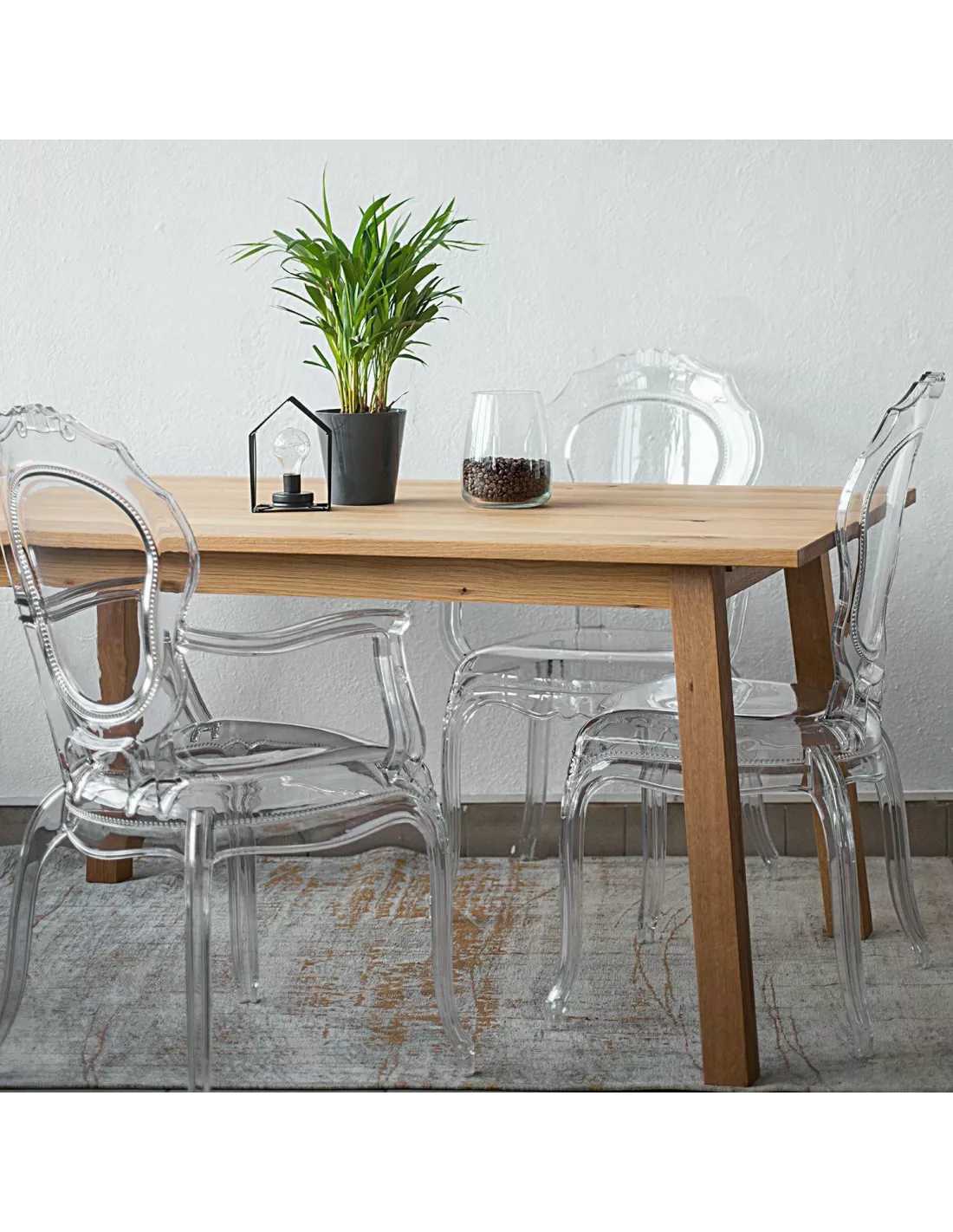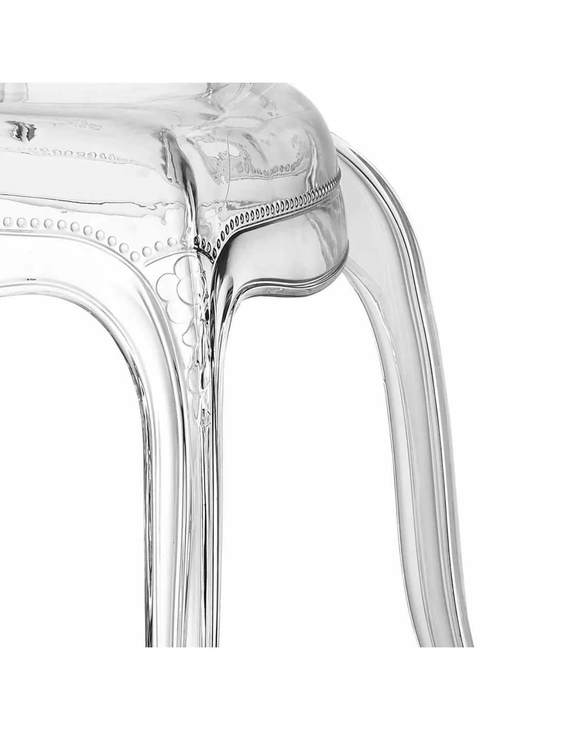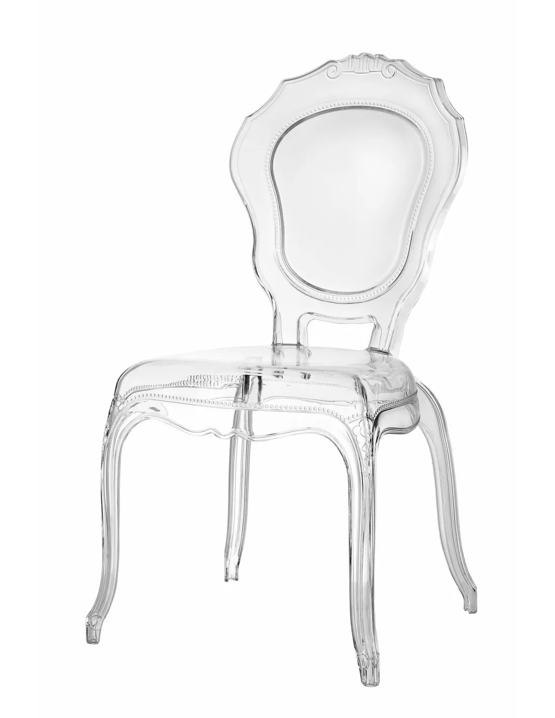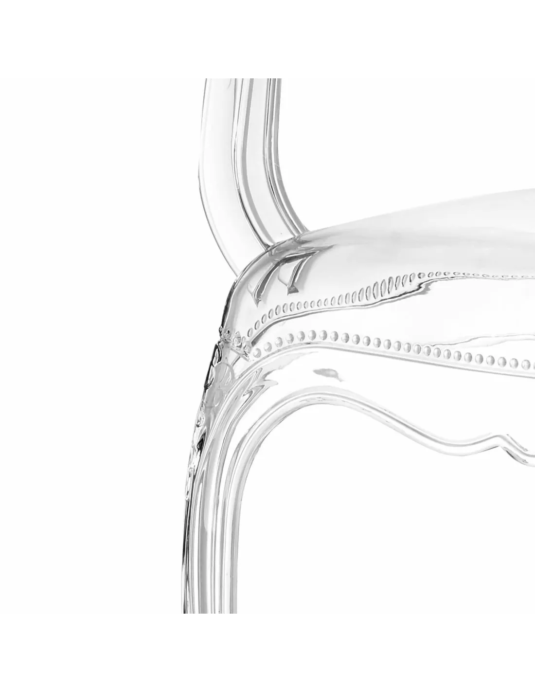 Elegancja, styl i design zamknięte w transparentnej użytkowej formie - poznaj krzesło Queen i zakochaj się w stylistyce glamour elegance! To modne przezroczyste krzesło nada klasy w niejednym pomieszczeniu domowym jak kuchnia, jadalnia, salon ale również w wszelkiego rodzaju lokalach usługowych typu restauracje, kawiarnie, salony piękności. Wykonane zostało z bardzo trwałego i odpornego materiału jakim jest poliwęglan, bez problemu wytrzyma nawet nacisk 140 kg!!! Krzesło Queen jest stabilne, nie chwieje się i nie przewraca, bardzo łatwe w utrzymaniu czystości - wystarczy przetrzeć ściereczką - a dzięki połyskowi naprawdę pięknie się prezentuje. Warto także zwrócić uwagę na wyprofilowane oparcie z dekoracyjnymi wzorami oraz finezyjnie lekko wygięte nogi. Od Ciebie zależy czy ustawisz je powtórzone w kilku sztukach przy stole w jadalni, czy jako pojedynczy element - ozdobę wnętrza. To właśnie połączenie designu i funkcjonalności zyskało już wielu amatorów na całym świecie. To zdecydowanie mój faworyt w kategorii transparentne krzesło do domu.