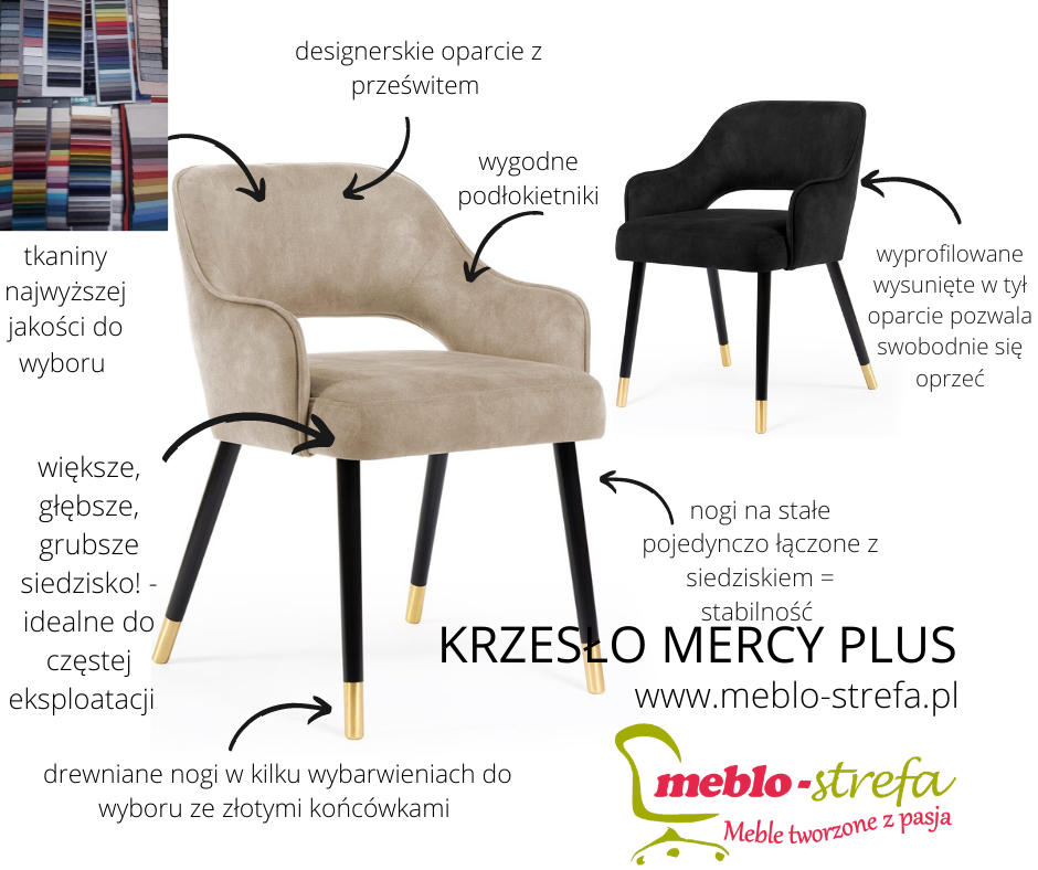Szukasz krzesła, w którym rozsiądziesz się wygodnie jak w fotelu, a które nie zajmie całej przestrzeni? Mercy to model idealny właśnie dla Ciebie! To tapicerowane krzesło stanowi świetną propozycję do wszystkich niebanalnych wnętrz, począwszy od eleganckich salonów po klimatyczne kawiarnie. Swój designerski wygląd zawdzięcza bardzo nietypowemu, wysuniętemu w tył oparciu - finezyjnie zaoblonemu z delikatnym prześwitem, który nadaje lekkości całej formie a siedzisku - głębokości. Krzesło tapicerowane Mercy to nie tylko mebel użytkowy ale ze względu na swój wygląd również element wystroju każdego pomieszczenia. Element dekoracyjny stanowi w tym przypadku kedra, wiodąca wzdłuż krawędzi oparcia oraz złote nabijane końcówki nóg. Optymalna wysokość podłokietników (62cm) umożliwia maksymalne dosunięcie go do stołu, świetnie sprawdzi się zatem w domowej jadalni.