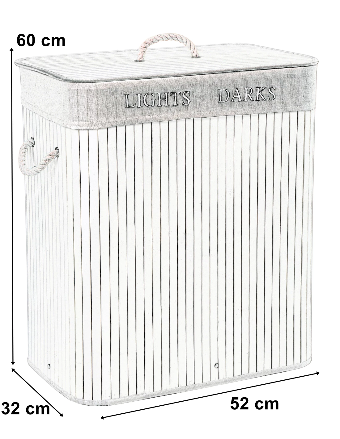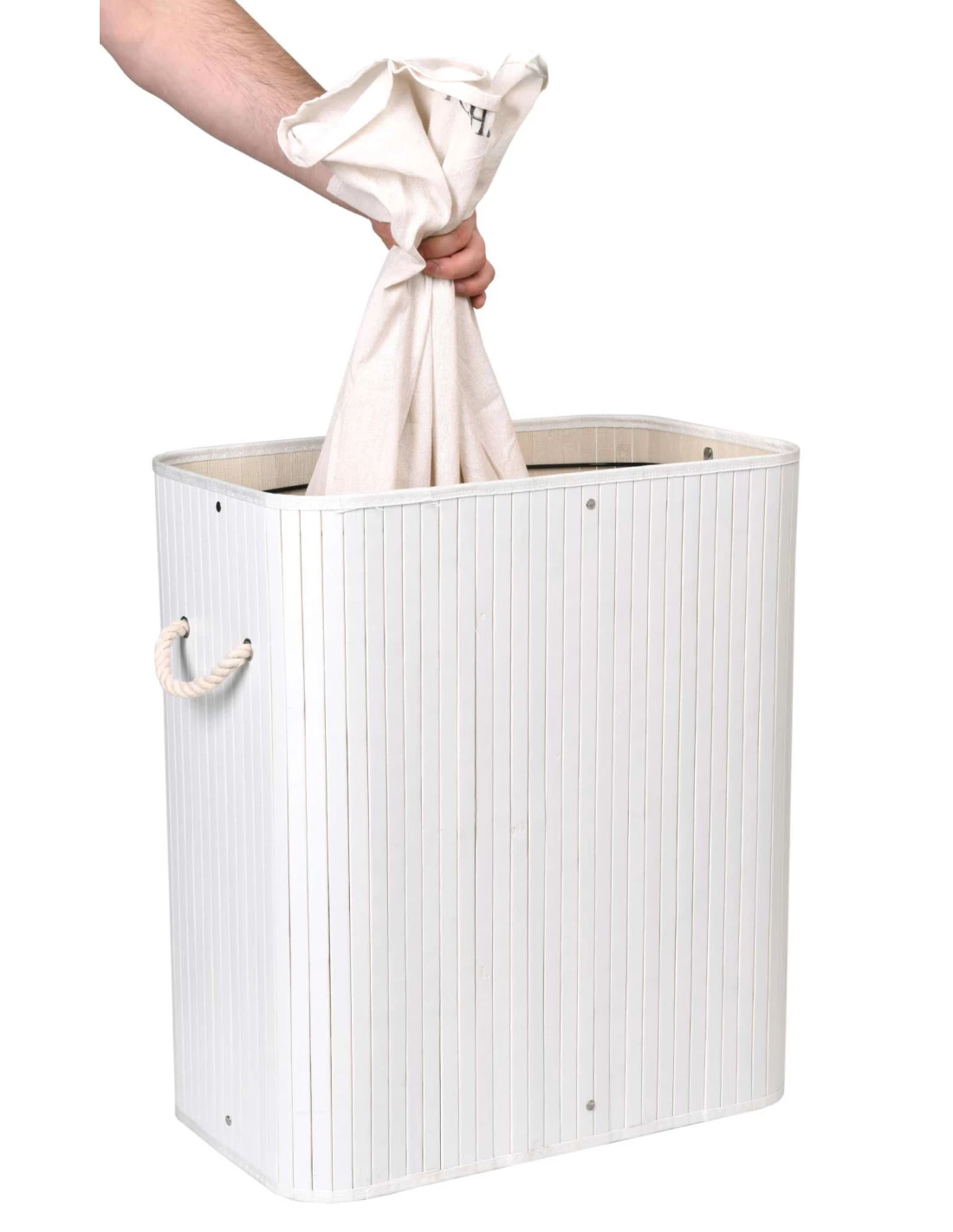 Bambusowy kosz to idealne uzupełnienie niemalże każdej łazienki. Ponadczasowy, modny bambus świetnie wpisze się zarówno w nowoczesne wnętrza jak i te w stylu retro czy skandynawskim. Pokrywa posiada estetyczny biały sznurek, służący jako rączka do otwierania. Podobne uchwyty znajdują się po bokach kosza, dzięki czemu z łatwością można go przenosić. Jego wnętrze podzielone zostało na dwie komory, dzięki czemu z łatwością posegregujesz odzież na długo przed jej praniem. Kosz zapewnia znajdującym się w nim ubraniom odpowiednią wentylację, jednocześnie zatrzymuje zapachy. Pojemność, aż 100 l. pozwala umieścić w jego wnętrzu naprawdę dużo rzeczy.