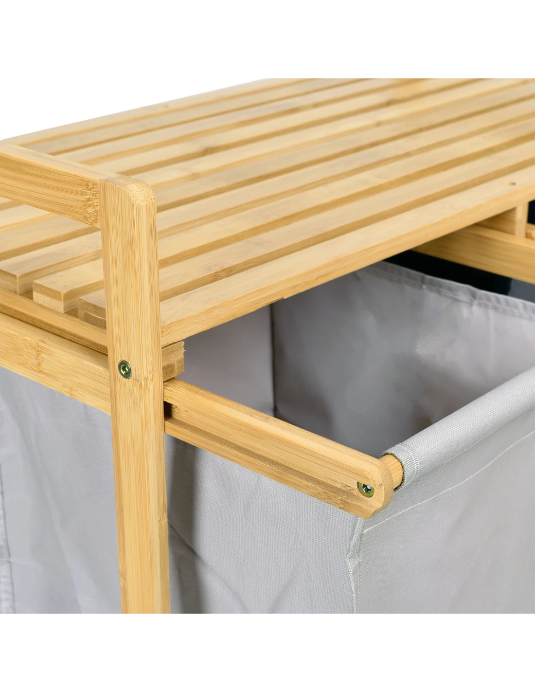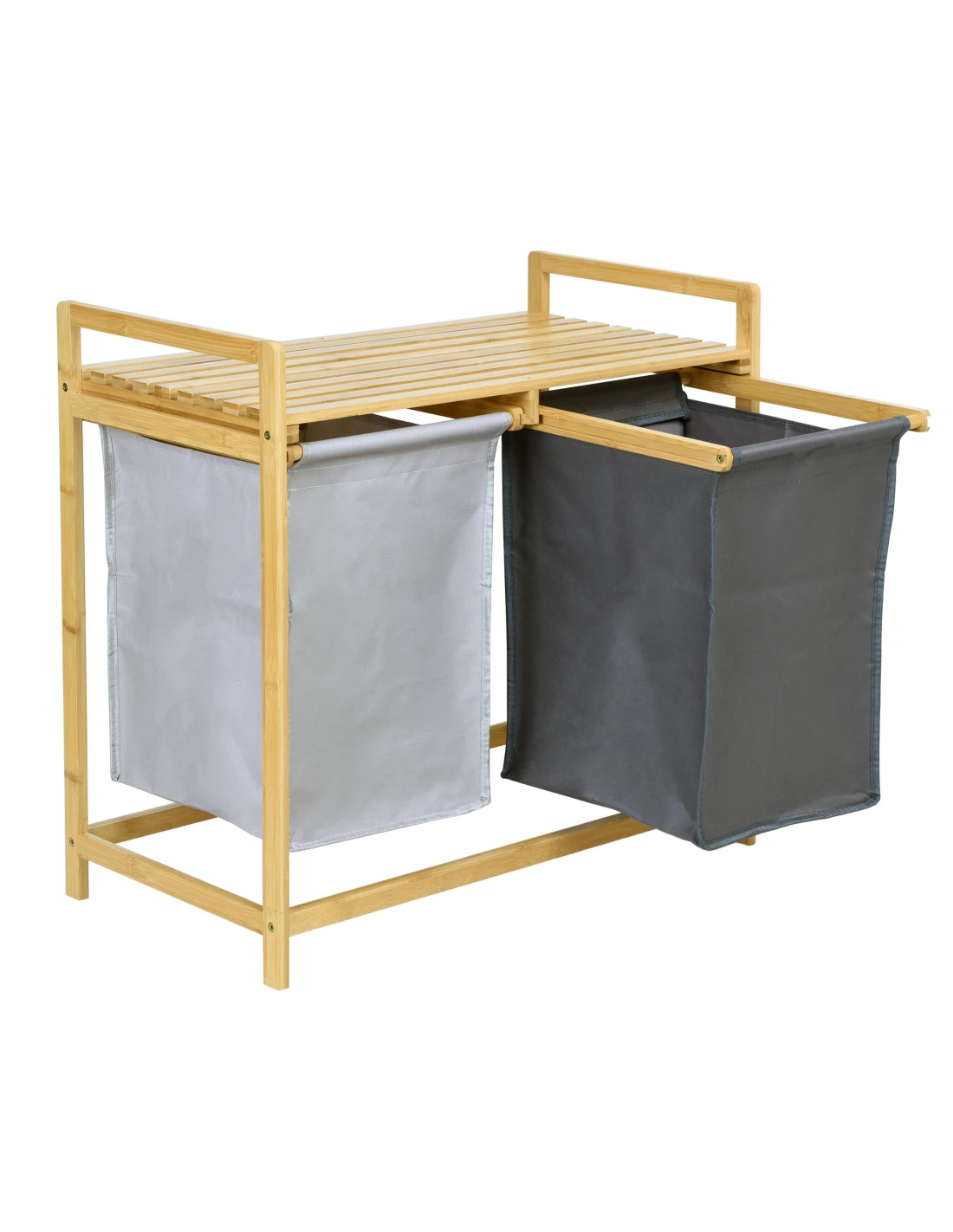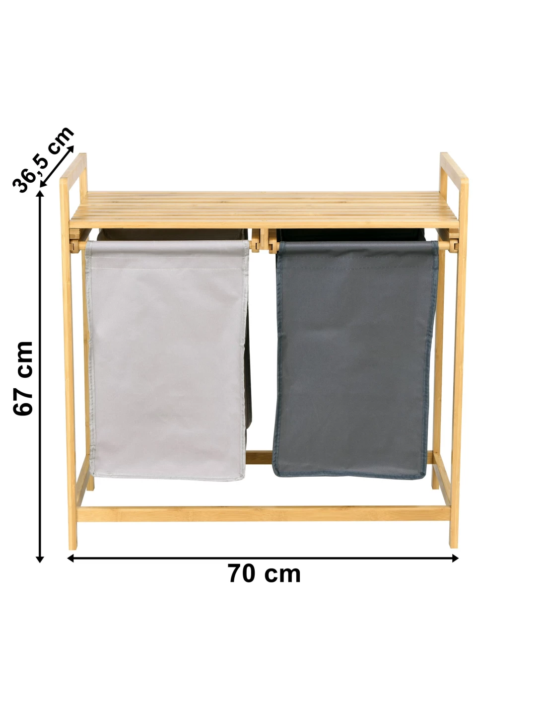 Kosz na pranie z blatem to idealne uzupełnienie każdej łazienki! Ponadczasowy, modny bambus świetnie wpisze się zarówno w nowoczesne wnętrza jak i te w stylu retro czy skandynawskim. Poliestrowe kosze w kolorze białym umieszczone zostały tutaj na bambusowym stelażu w naturalnym odcieniu. Zastosowano w nich rzepy, dzięki którym szybko i łatwo zdejmiesz kosz w razie potrzeby lub prania. Kosze o pojemności 40l każdy, wysuwane są na szynach, bez problemu więc wyjmiesz i włożysz odzież. Funkcjonalności dostarcza także blat, który przyda się na odłożenie ręczników, kosmetyków czy środków czystości.