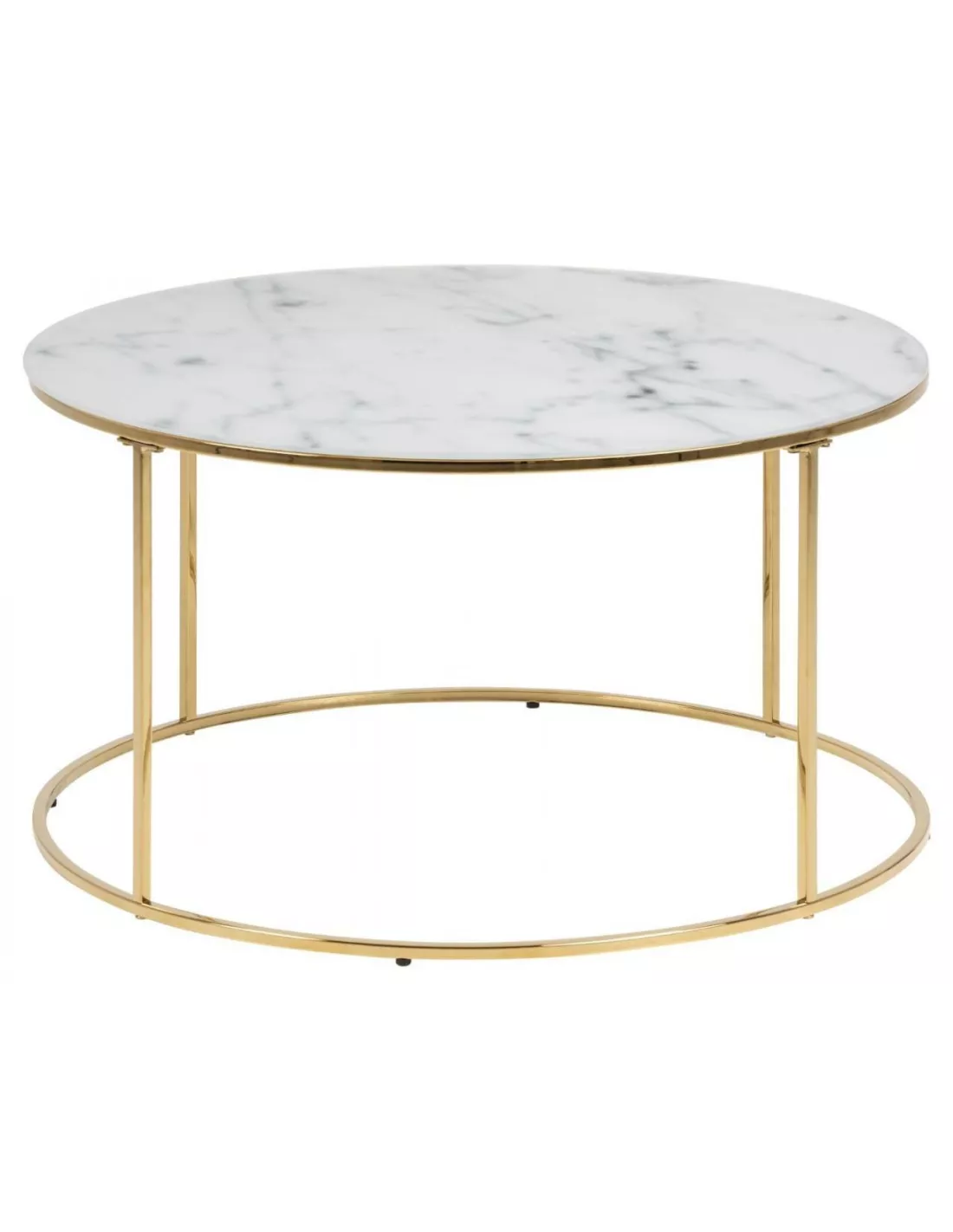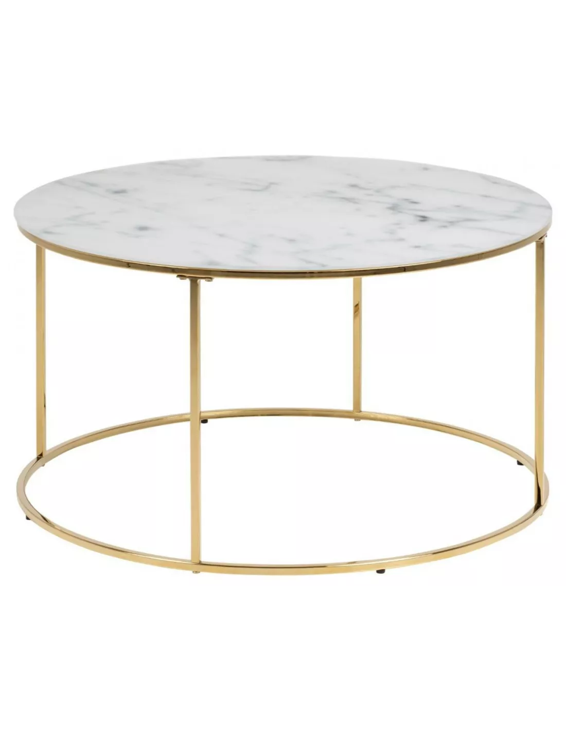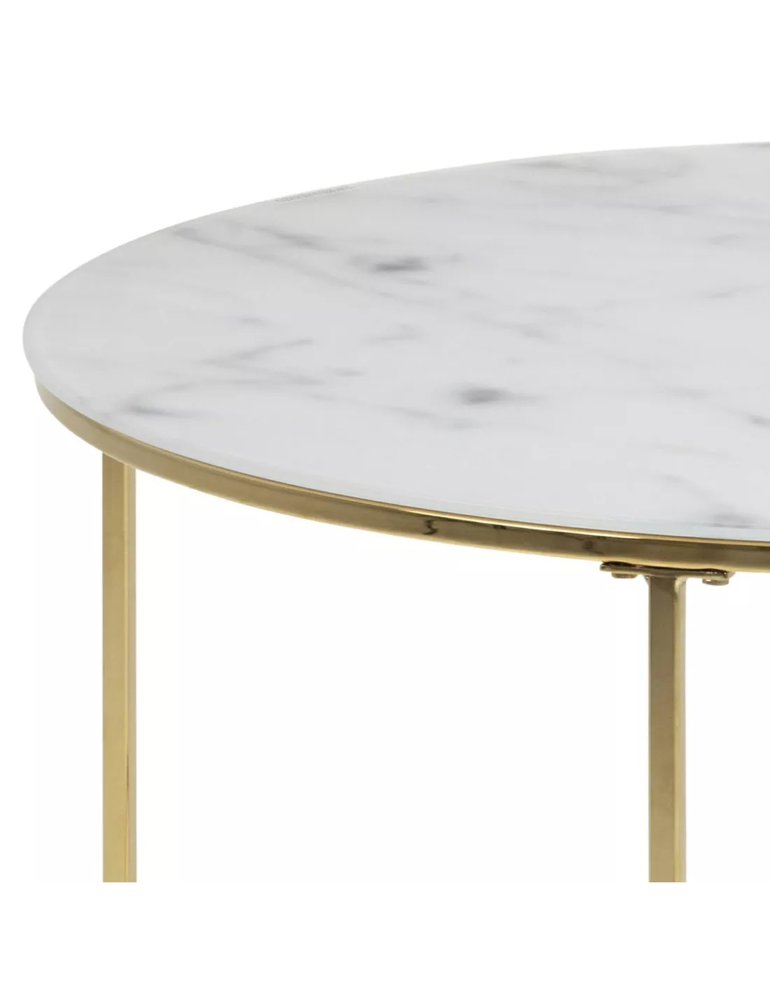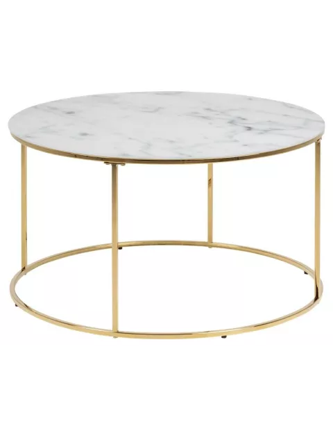 Odpowiedni stolik kawowy do Twojego salonu? Poznaj model Bolton, którego blat zachwyca! Inspirowany marmurem stanowi niebanalne połączenie rożnych odcieni bieli i szarości malowanych na grubym, hartowanym szkle. Jest dość duży (fi 80 cm), dzięki czemu jego powierzchnię wykorzystasz nie tylko na filiżanki z kawą ale także na ozdobny, wazon z kwiatami, piloty do TV itd. Blat wspiera się na metalowym stelażu malowanym proszkowo na kolor złoty. Połączenie szkła i metalu idealnie wpisuje się w najnowsze trendy urządzania wnętrz, zarówno tych w stylu glamour jak i nowoczesnym.