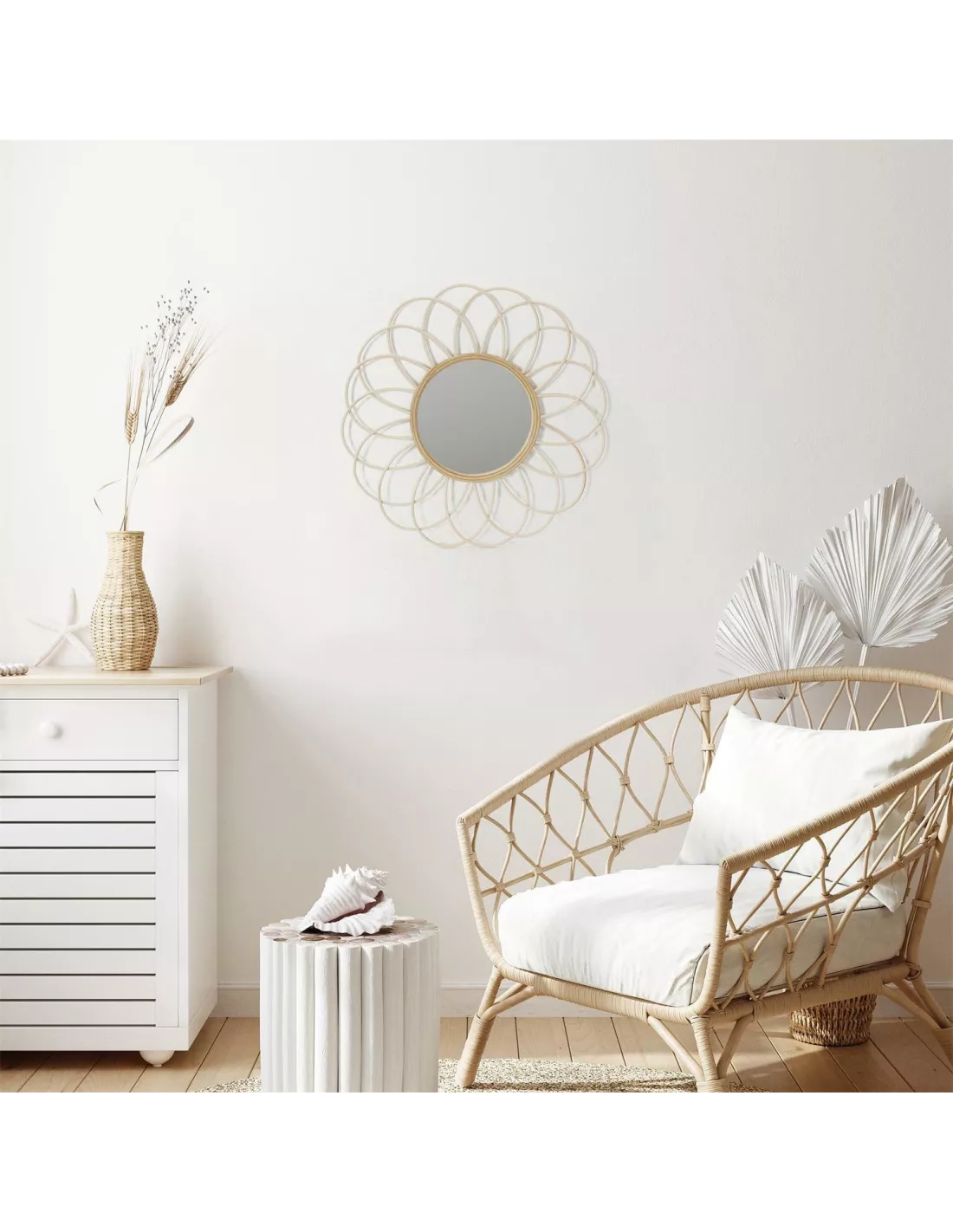Dekoracyjne lustro Serifos to świetny pomysł na uzupełnienie każdego nowoczesnego wnętrza. Posiada przepiękną ramę wykonaną z naturalnego rattanu, nawiązującą swoim kształtem do mandali. Ten ciekawy wzór świetnie wpisuje się w najnowsze trendy aranżacji wnętrz, wprowadzając przyjemną atmosferę.