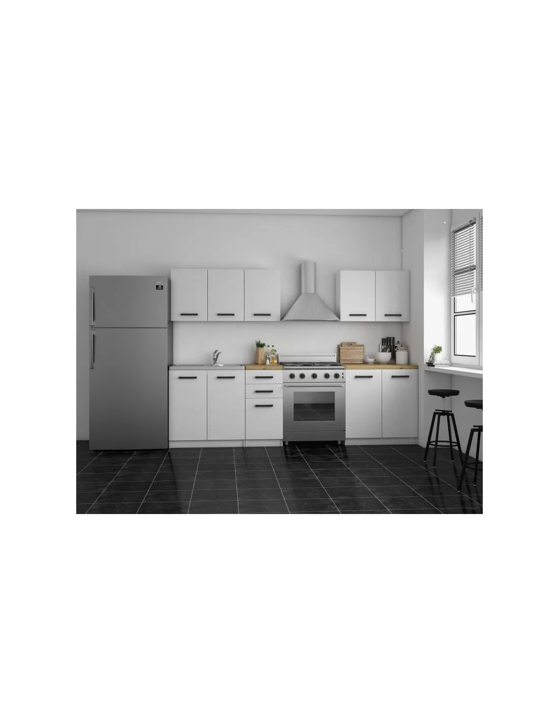 Zestaw mebli do kuchni Set 200 uczyni każde kuchenne wnętrze funkcjonalnym i ergonomicznym. Minimalistyczny design mebli idealnie wpisuje się w najnowsze trendy aranżacyjne i doskonale współgra z drewnopodobnym blatem jak i klasycznymi satynowymi uchwytami.