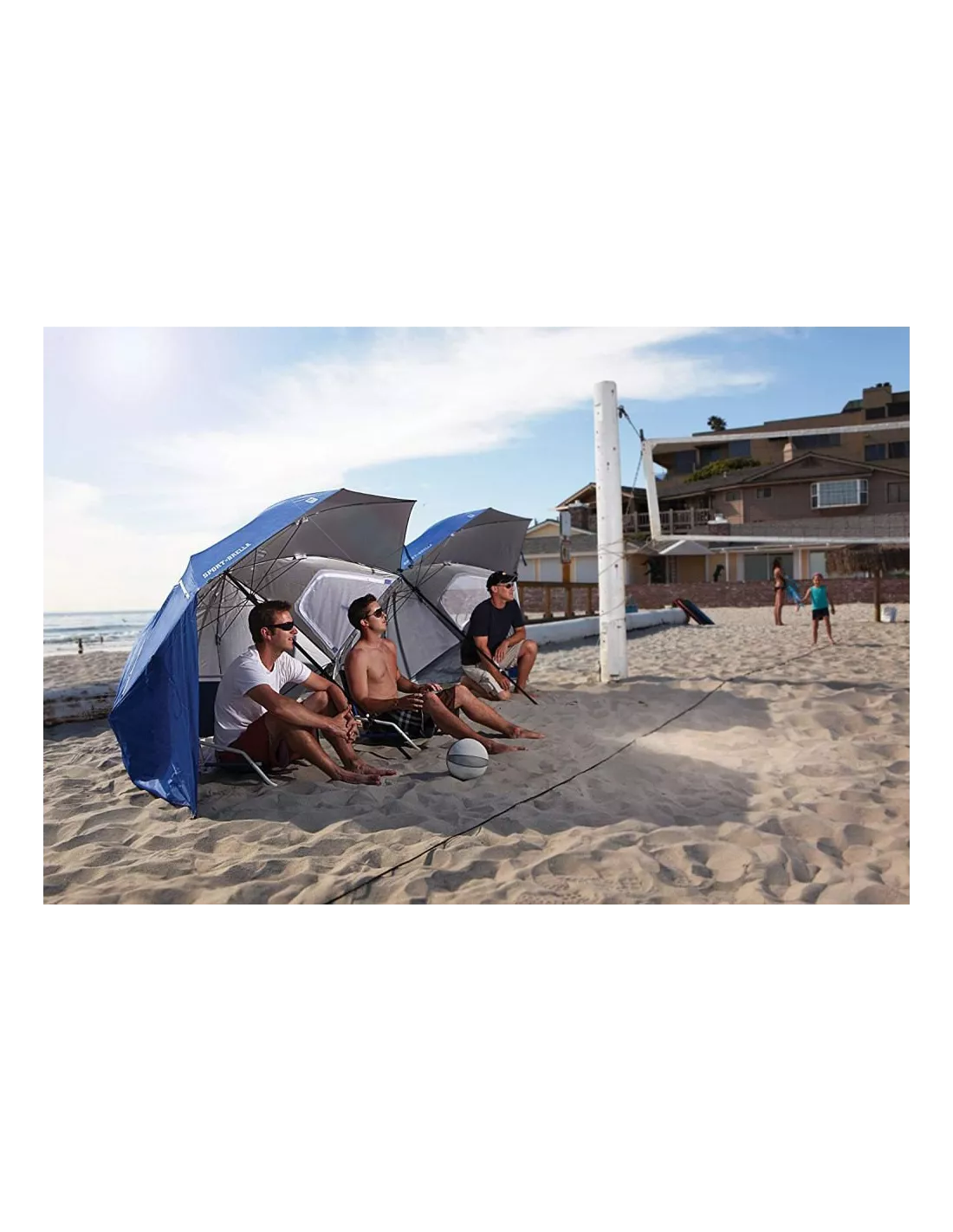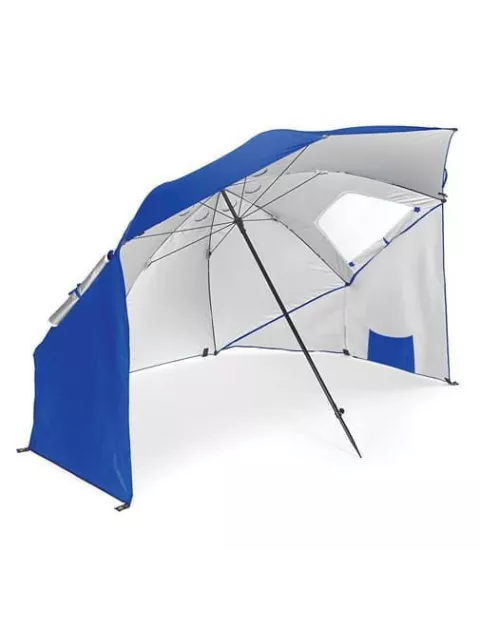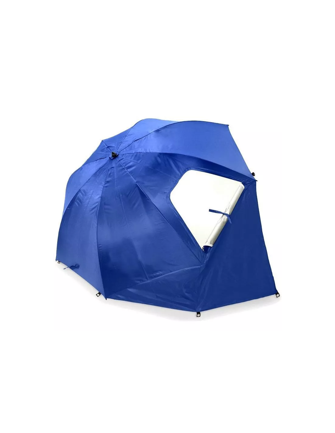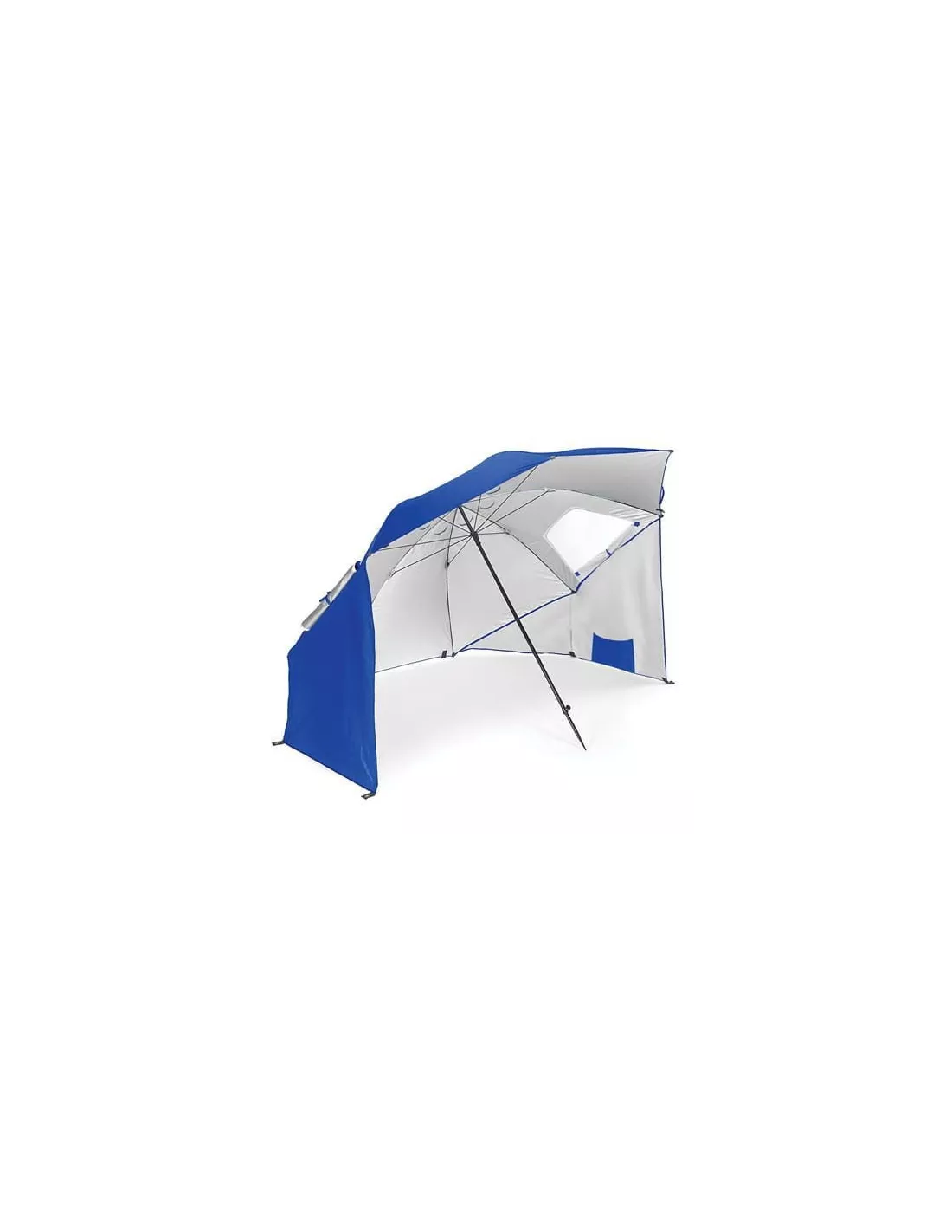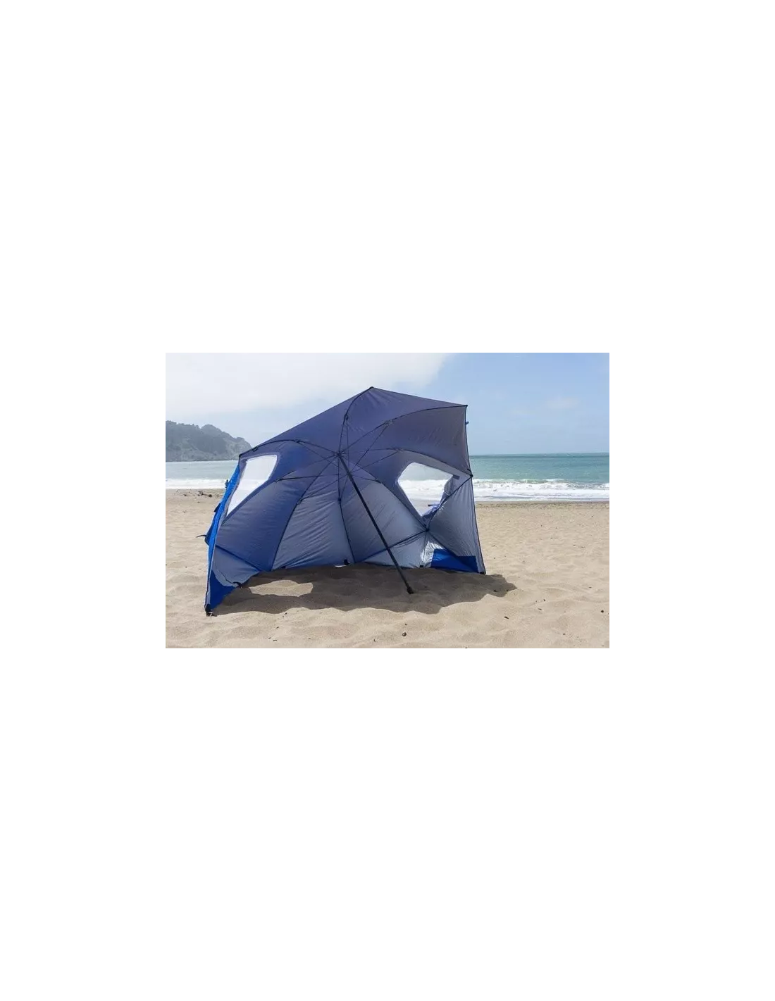 Parasol z funkcją namiotu - staje się nim po rozłożeniu dodatkowych ścianek ( ścianki, dzięki kotwom wbijanym w otwory można stabilnie przytwierdzić do podłoża). Na plaży chroni nas nie tylko przed nadmiarem słońca ale także wiatrem i przenoszonym w powietrzu piaskiem. Zapewnia także prywatność i pozwala na schronienie w przypadku nagłych opadów. Świetnie sprawdzi się na rodzinne wyjazdy, zajmuje mało miejsca w bagażniku a torba transportowa znacznie ułatwia przenoszenie.