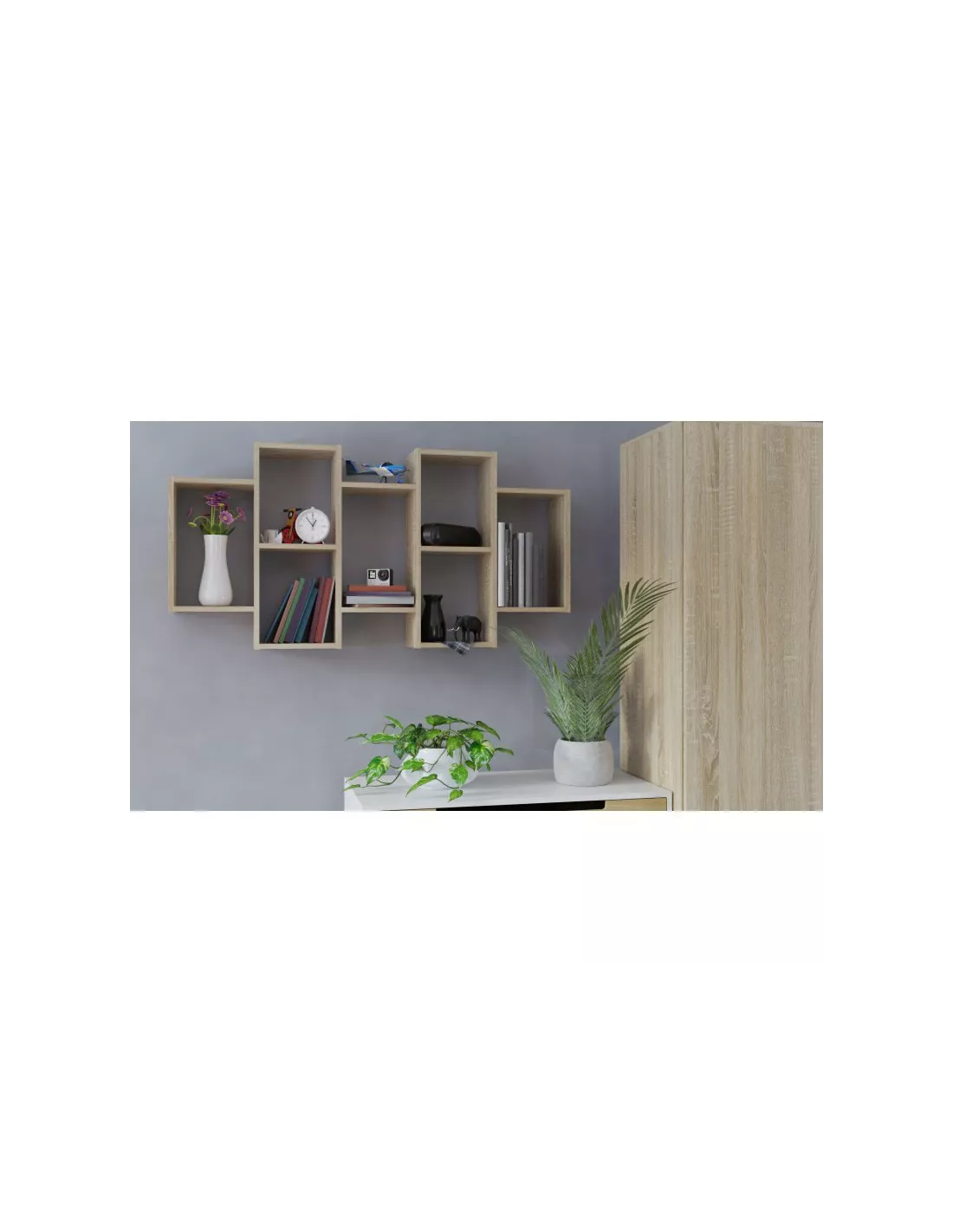 Model Bilbao to zestaw 7 połączonyc ze sobą półek, dzięki czemu zyskują modny design, który pasuje do wielu wnętrz. Ich montaż jest bardzo prosty, gdyż półki przylegają do siebie. Wystarczy powiesić na dowolnej ścianie. Ich grubość przyciąga uwagę i wskazuje na solidność. Półki ścienne to doskonała okazja do wyeksponowania ozdób, pamiątek, zdjęć czy nawet kwiatów.