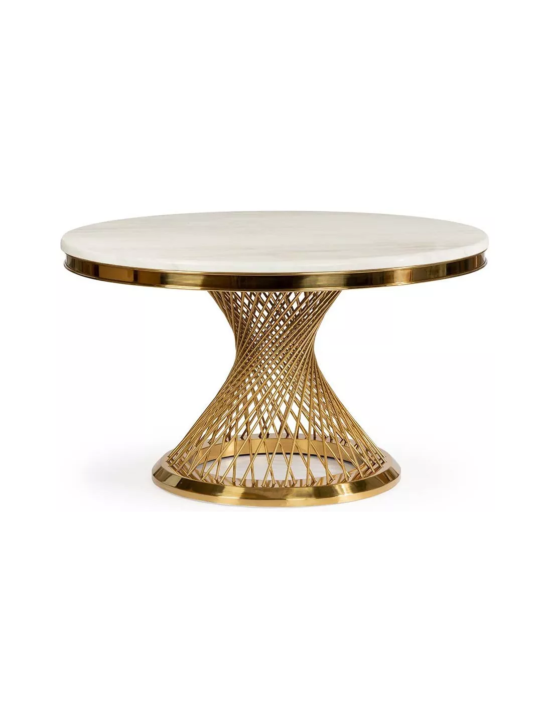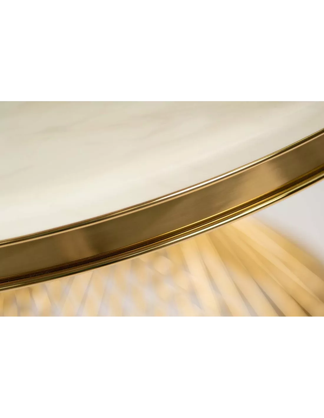 Duży okrągły blat o średnicy, aż 130 cm - idealnie sprawdzi się zarówno w domowej kuchni glamour jak i jadali z klasą. Funkcjonalny, pozostaje przy tym ergonomiczny, nie zagarniając całej przestrzeni wokół. Romance ujmuje także samym wyglądem blatu, który do złudzenia przypomina prawdziwy marmur, będąc de facto kompozytem. Wartość dodaną stanowi w tym przypadku odpowiednie wyfrezowanie krawędzi, która została pozbawiona ostrego rantu. Zabieg ten z pewnością wpłynie nie tylko na walory wizualne ale także bezpieczeństwo użytkowania. Estetyki dodaje złota rama, którą został objęty blat.