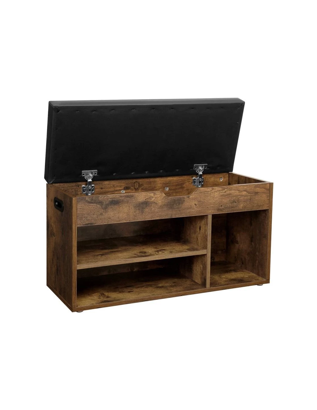 Szafka otwarta na buty to nowoczesna alternatywa dla mebli do przedpokoju. Wykonana w kolorze rustykalnego dębu, pasować będzie zarówno do nowoczesnych, loftowych jak i rustykalnych przestrzeni. Szafka na obuwie posiada łącznie 3 półki, z których jedna pozwala na odłożenie wysokiego obuwia typu kozaki. Szafka posiada tapicerowane skóą typu PU siedzisko, w kolorze czarnym. Wypełnione pianką zapewnia komfortowe siedzenia, podczas zmiany obuwia. Siedzisko dzięki możliwości podnoszenia do góry - skrywa schowek - przydatny na szale, czapki, rękawiczki...