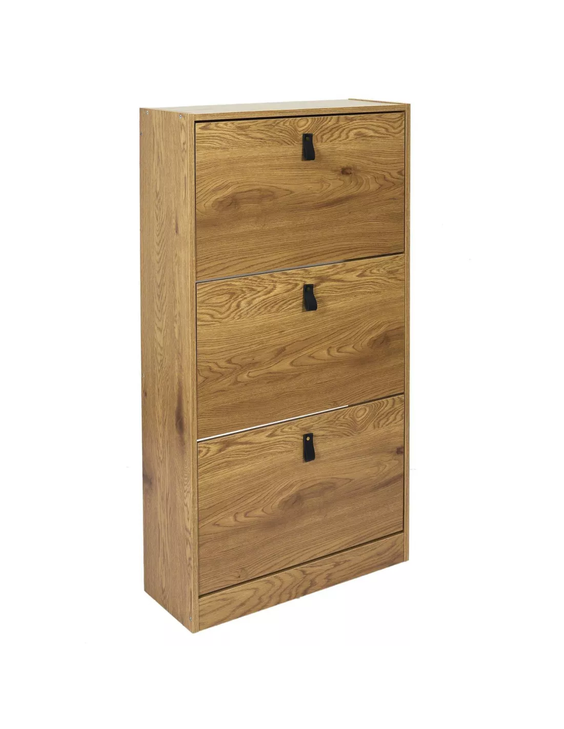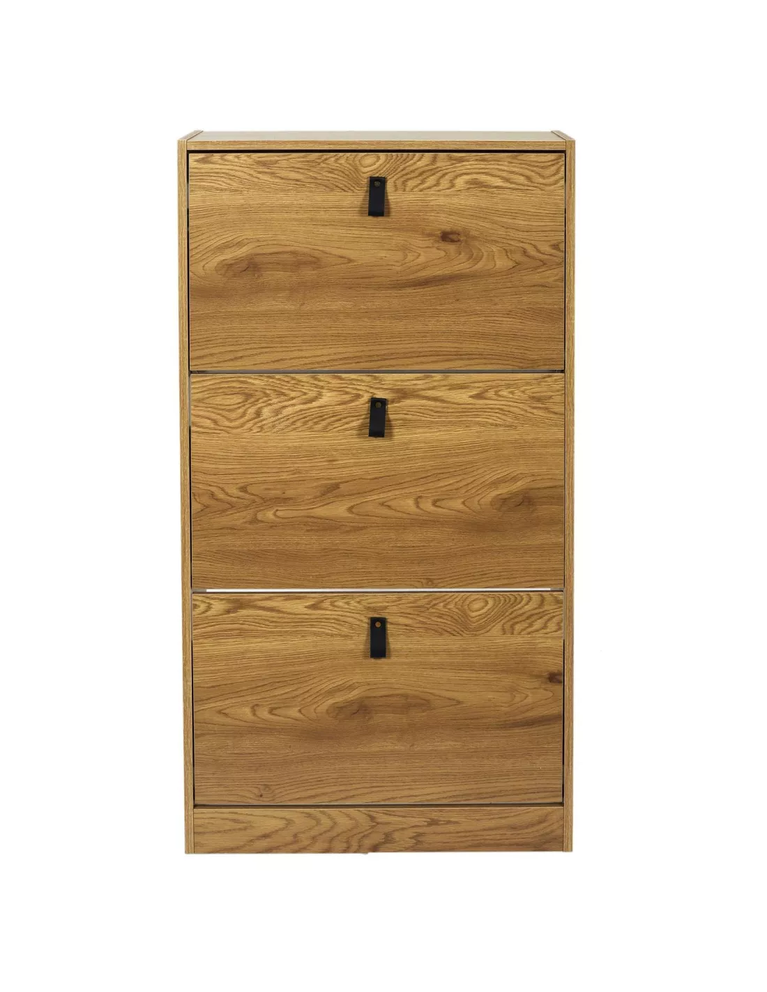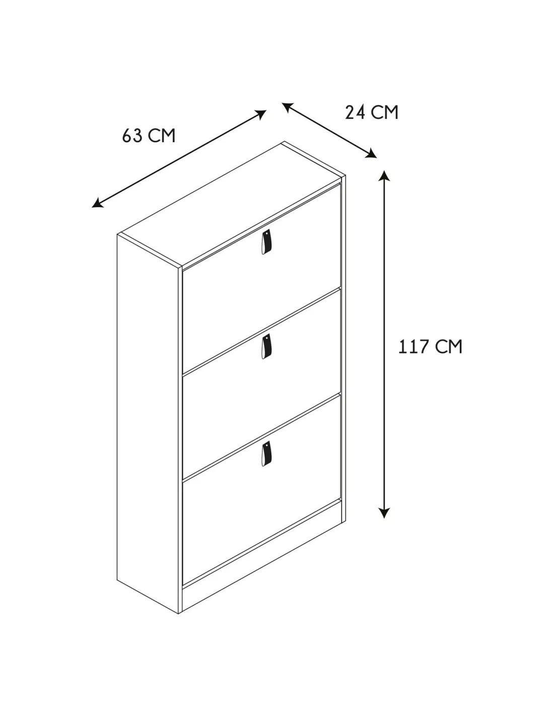Szafka na buty Abbott to świetna propozycja do każdego przedpokoju. Szafka wyposażona w trzy dwurzędowe kosze na obuwie, które z powodzeniem pomieszczą 20 par butów. Mebel posiada wykończenie ABS, wykonany jest z płyty odpornej na ścieranie MDF - dzięki czemu będziesz się nim cieszyć przez bardzo długi czas. Szafka do przedpokoju wyposażona w 3 uchylne fronty z pięknymi skórzanymi uchwytami. Szafka jest bardzo wąska - 24 cm - idealnie sprawdzi się zatem w niewielkich, ciasnych przedpokojach.