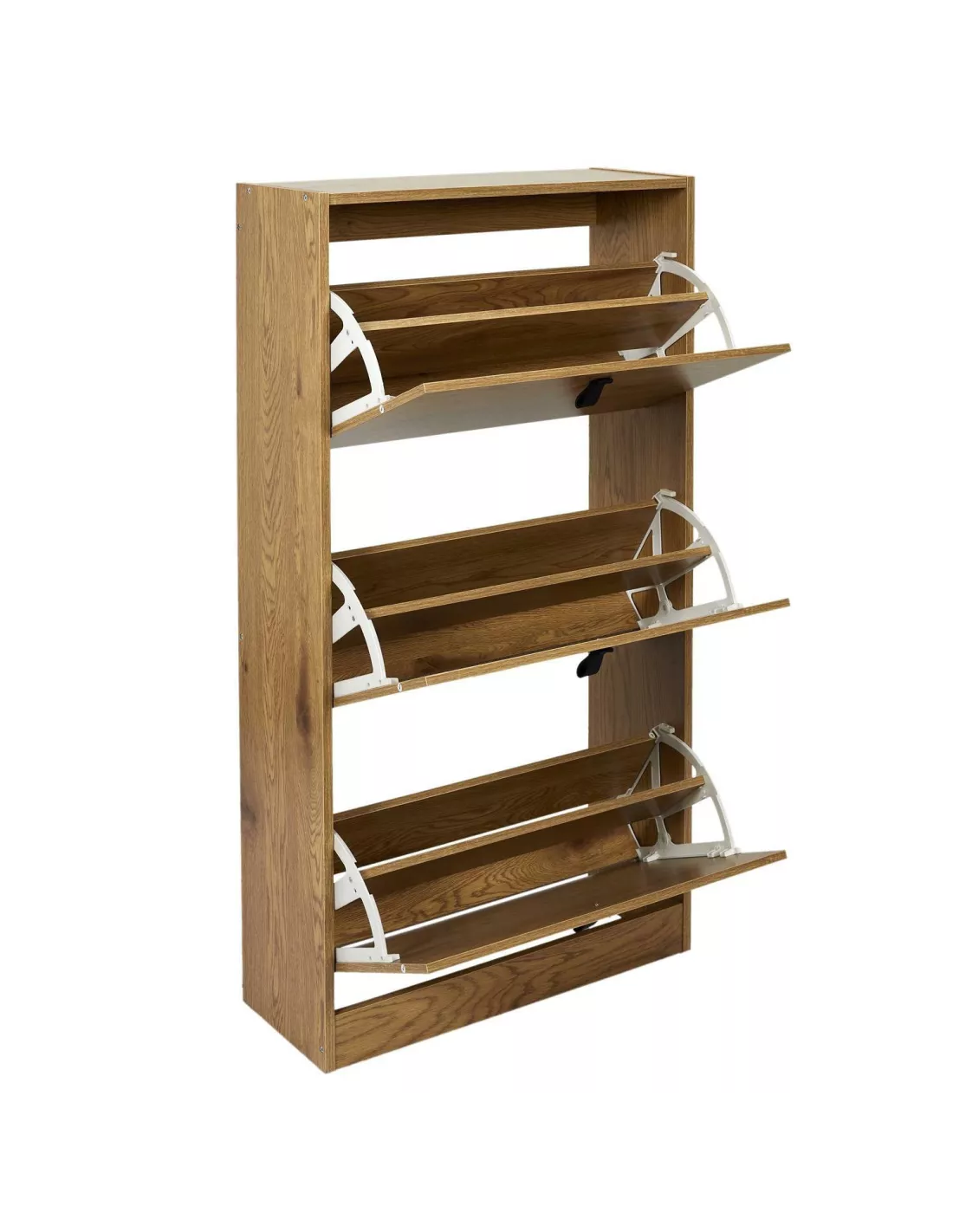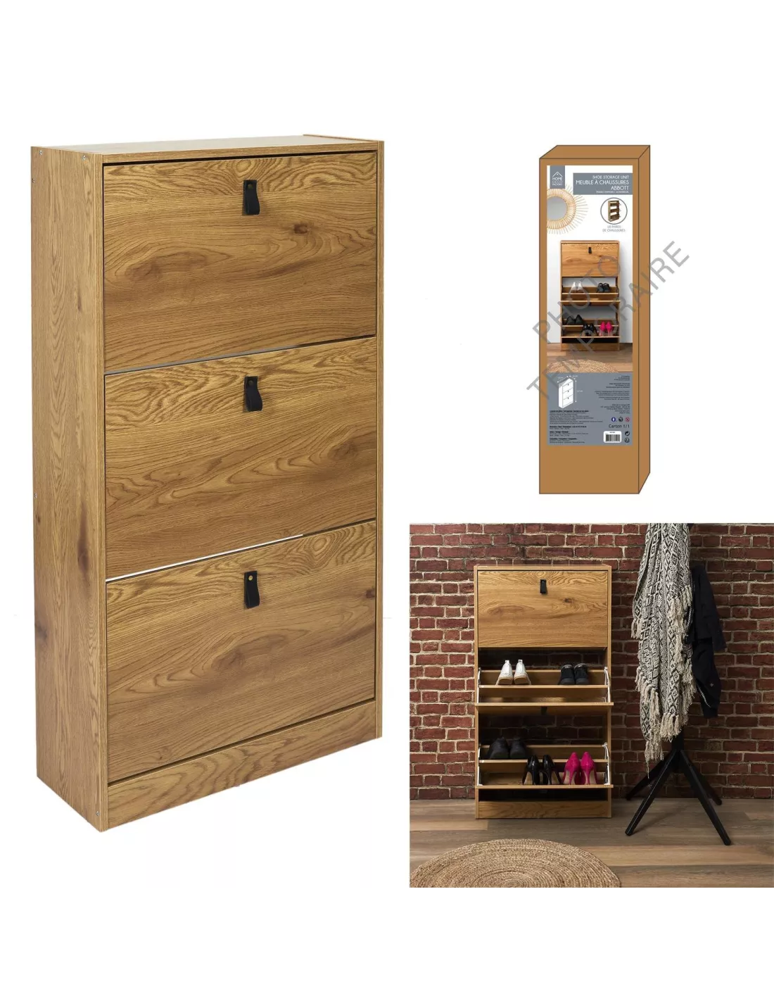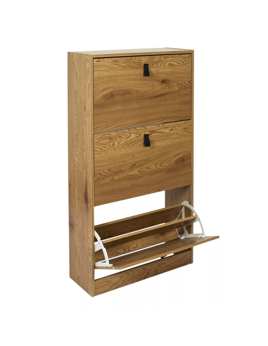 Szafka na buty Abbott to świetna propozycja do każdego przedpokoju. Szafka wyposażona w trzy dwurzędowe kosze na obuwie, które z powodzeniem pomieszczą 20 par butów. Mebel posiada wykończenie ABS, wykonany jest z płyty odpornej na ścieranie MDF - dzięki czemu będziesz się nim cieszyć przez bardzo długi czas. Szafka do przedpokoju wyposażona w 3 uchylne fronty z pięknymi skórzanymi uchwytami. Szafka jest bardzo wąska - 24 cm - idealnie sprawdzi się zatem w niewielkich, ciasnych przedpokojach.