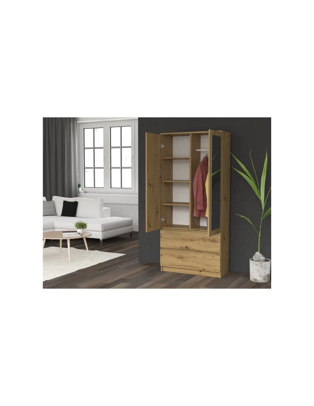Niniejsza szafa - garderoba SS-90 w kolorze dąb artisan posiada drążek, na którym z powodzeniem możesz zawiesić wszystkie swoje ubrania oraz 4 funkcjonalne półki na odzież, jak i na dokumenty. Dodatkowo, szafa została wyposażona w 2 wysuwane szuflady przystosowane do przechowywania przedmiotów codziennego użytku. Model wykonany z materiałów najwyższej jakości, włączając w to płytę laminowaną 16mm, której krawędzie zostały oklejone ABS. Dzięki temu mebel jest odporny na wilgoć oraz uszkodzenia mechaniczne. Szuflady zostały wyposażone w prowadnice rolkowe, zapewniające bezpieczne użytkowanie, a bezuchwytowe fronty pozwalają na utrzymanie komfortu użytkowania na najwyższym poziomie.