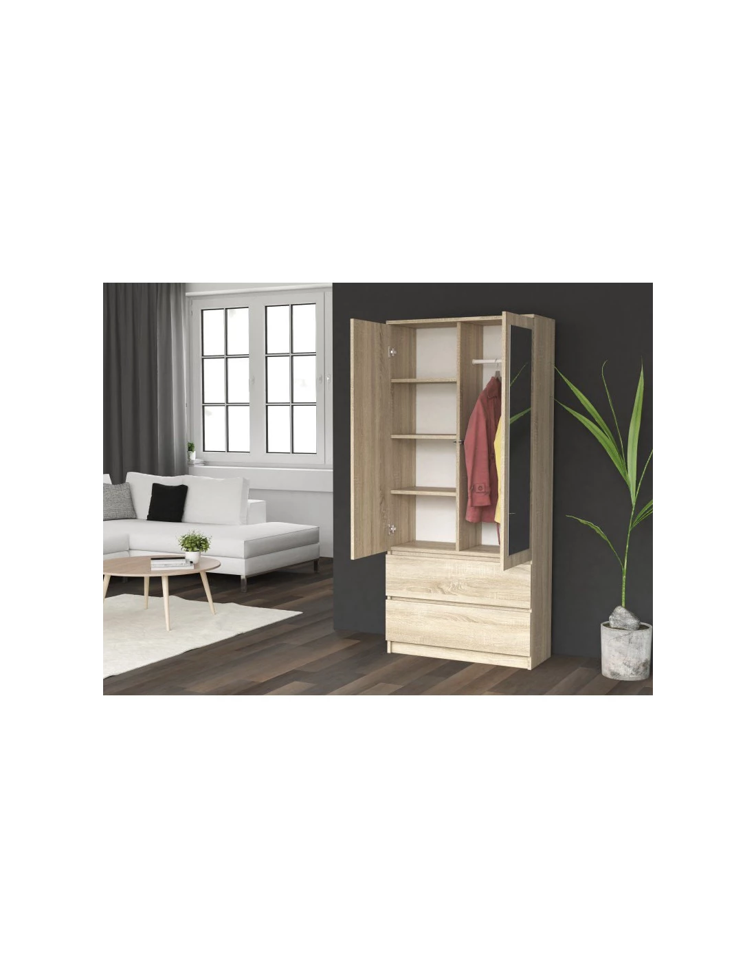 Niniejsza szafa - garderoba SS-90 w kolorze dąb sonoma posiada drążek, na którym z powodzeniem możesz zawiesić wszystkie swoje ubrania oraz 4 funkcjonalne półki na odzież, jak i na dokumenty. Dodatkowo, szafa została wyposażona w 2 wysuwane szuflady przystosowane do przechowywania przedmiotów codziennego użytku. Model wykonany z materiałów najwyższej jakości, włączając w to płytę laminowaną 16mm, której krawędzie zostały oklejone ABS. Dzięki temu mebel jest odporny na wilgoć oraz uszkodzenia mechaniczne. Szuflady zostały wyposażone w prowadnice rolkowe, zapewniające bezpieczne użytkowanie, a bezuchwytowe fronty pozwalają na utrzymanie komfortu użytkowania na najwyższym poziomie.