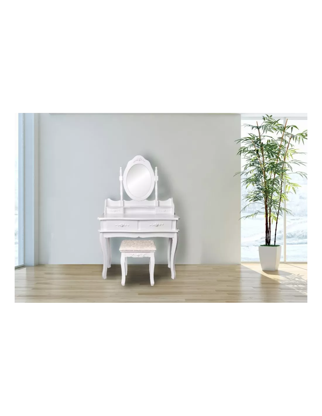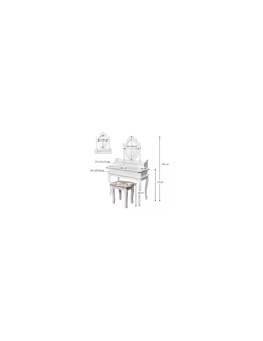 Toaletka kosmetyczna, konsola 4SZ to zaprojektowany specjalnie z myślą o kobietach piękny, stylowy mebel. Utrzymany w stylistyce vintage posiada ozdobne ornamenty, zaokrąglenia i wyżłobienia. Toaletka posiada łącznie, 4 szufladki, które z powodzeniem pomieszczą wszystkie kosmetyki i akcesoria. Niebanalny design sprawia, że ta toaletka poza swoją pierwotną funkcją może służyć również jako element wystroju wnętrza. Ta konsola posiada duże uchylne, owalne lustro po środku, które doskonale odbija, bez zniekształceń i cieni. W skład zestawu wchodzi również tapicerowane krzesełko - stołek, którego siedzisko zostało poszyte pięknym, kobiecym materiałem.