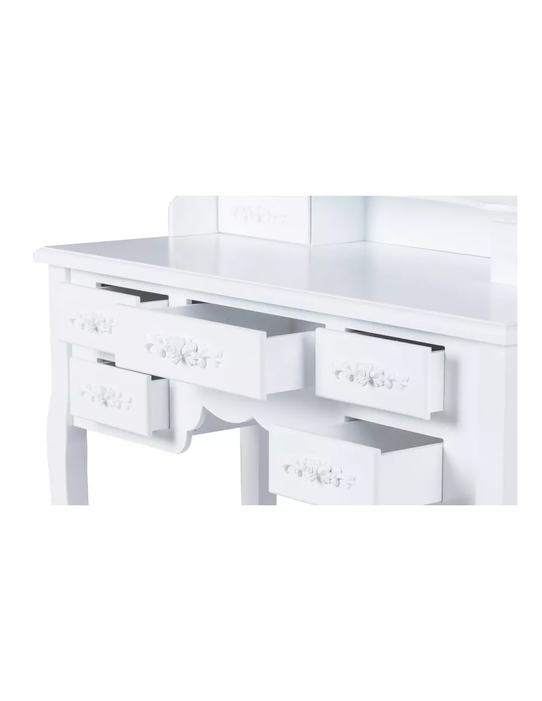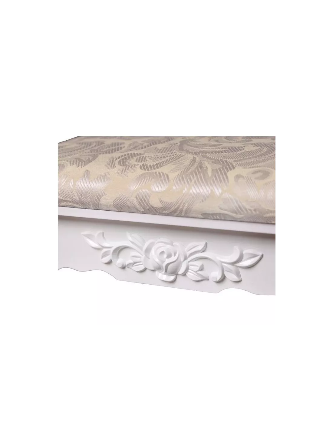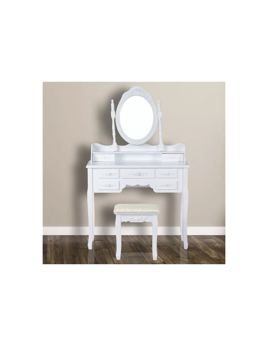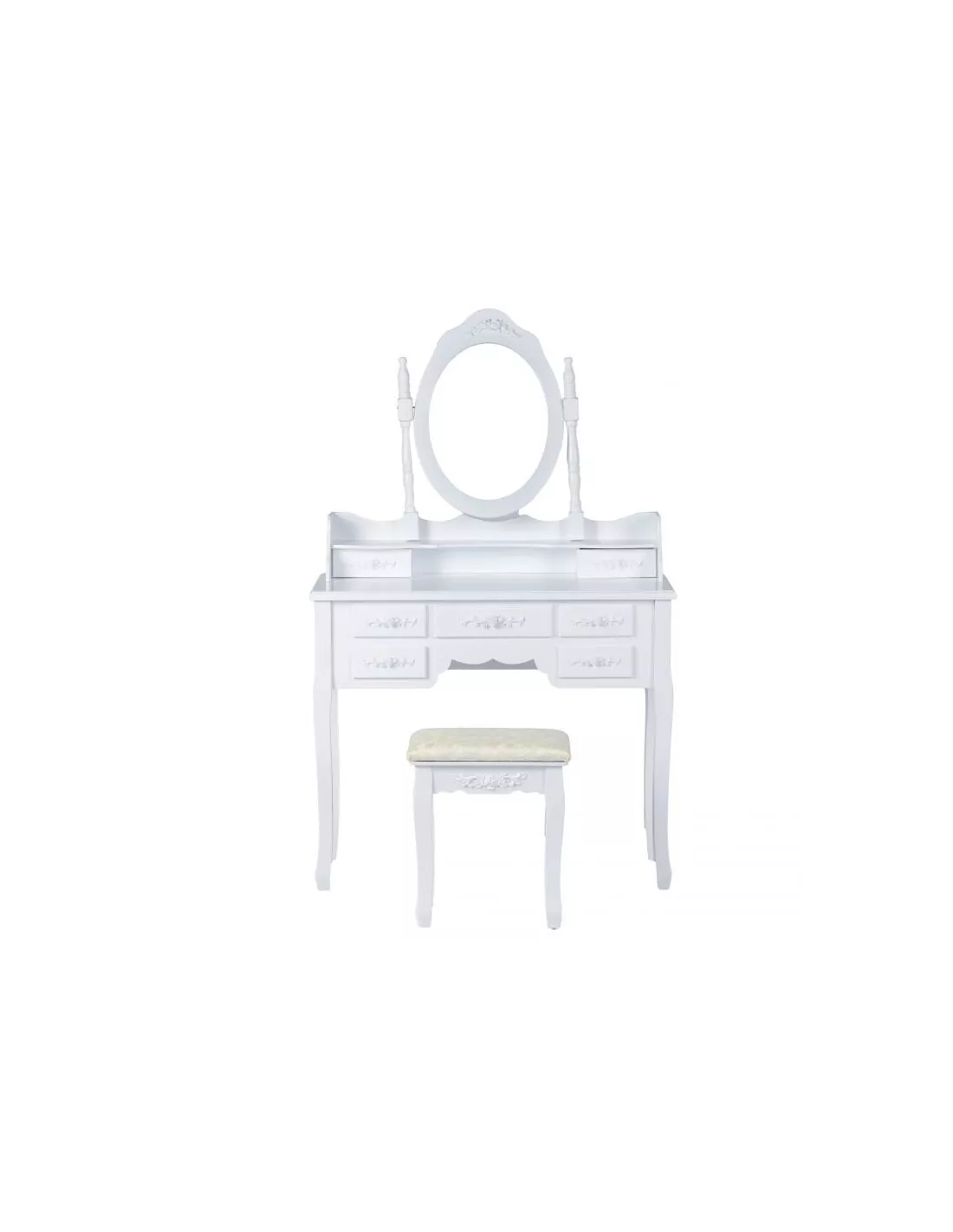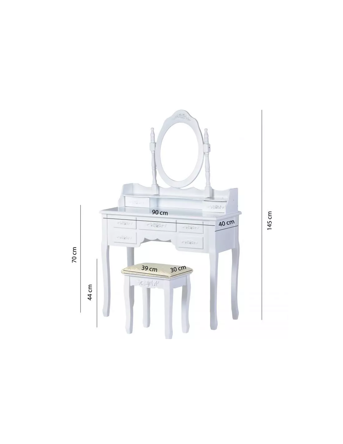 Toaletka kosmetyczna, konsola 7SZ to zaprojektowany specjalnie z myślą o kobietach piękny, stylowy mebel. Utrzymany w stylistyce vintage posiada ozdobne ornamenty, zaokrąglenia i wyżłobienia. Toaletka posiada łącznie, aż 7 szufladek, które z powodzeniem pomieszczą wszystkie kosmetyki i akcesoria. Niebanalny design sprawia, że ta toaletka poza swoją pierwotną funkcją może służyć również jako element wystroju wnętrza. Ta konsola posiada duże uchylne, owalne lustro po środku, które doskonale odbija, bez zniekształceń i cieni. W skład zestawu wchodzi również tapicerowane krzesełko - stołek, którego siedzisko zostało poszyte pięknym, kobiecym materiałem.