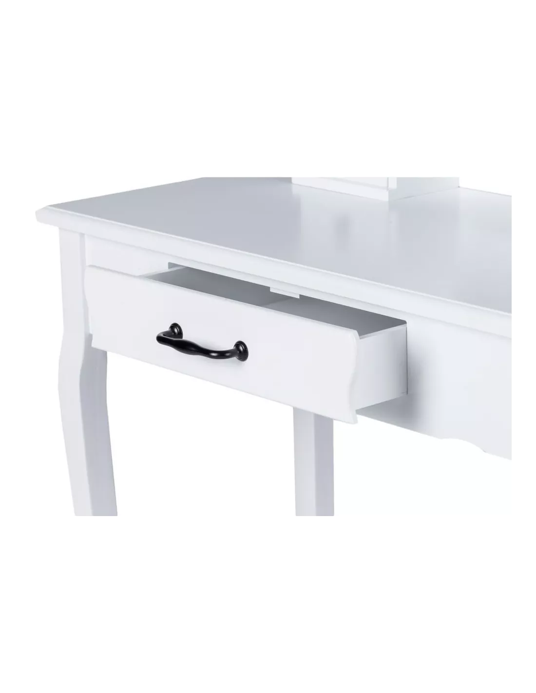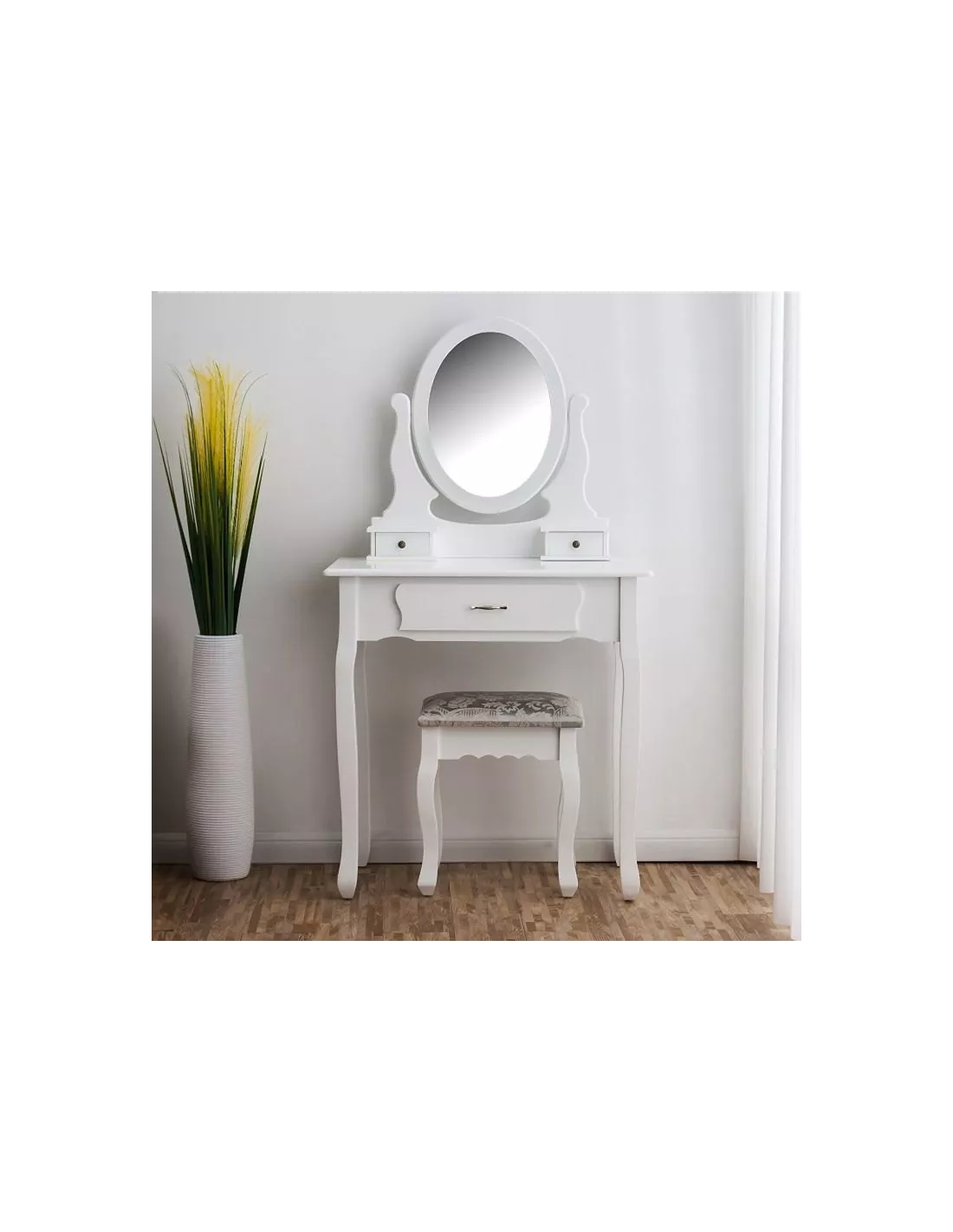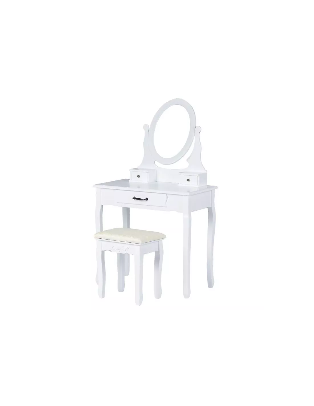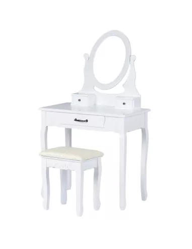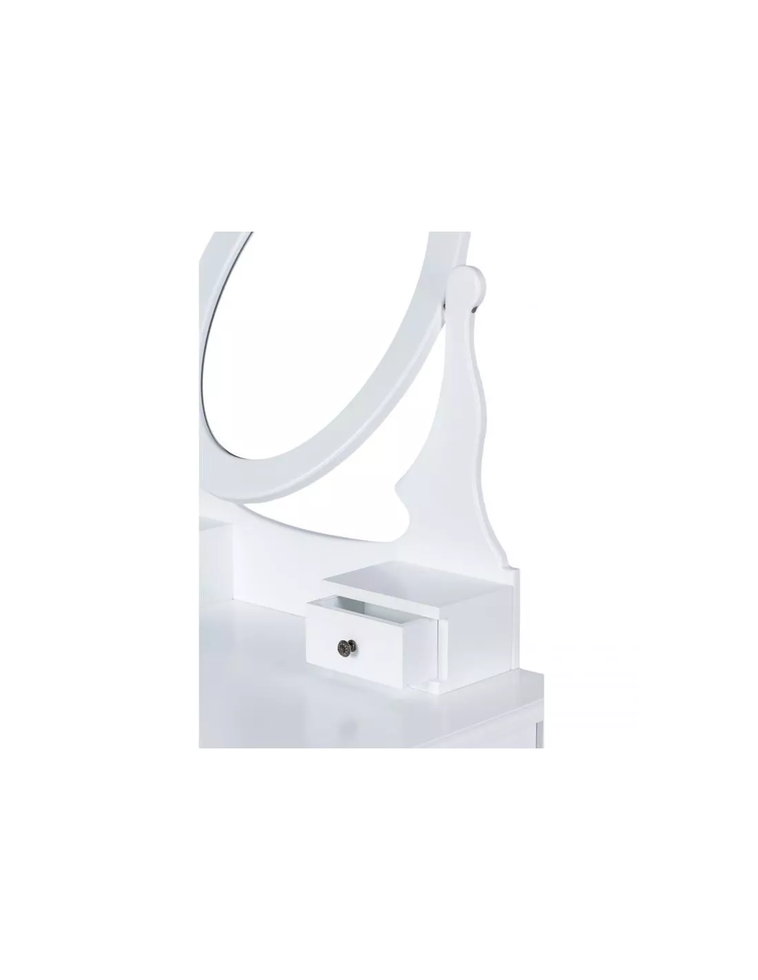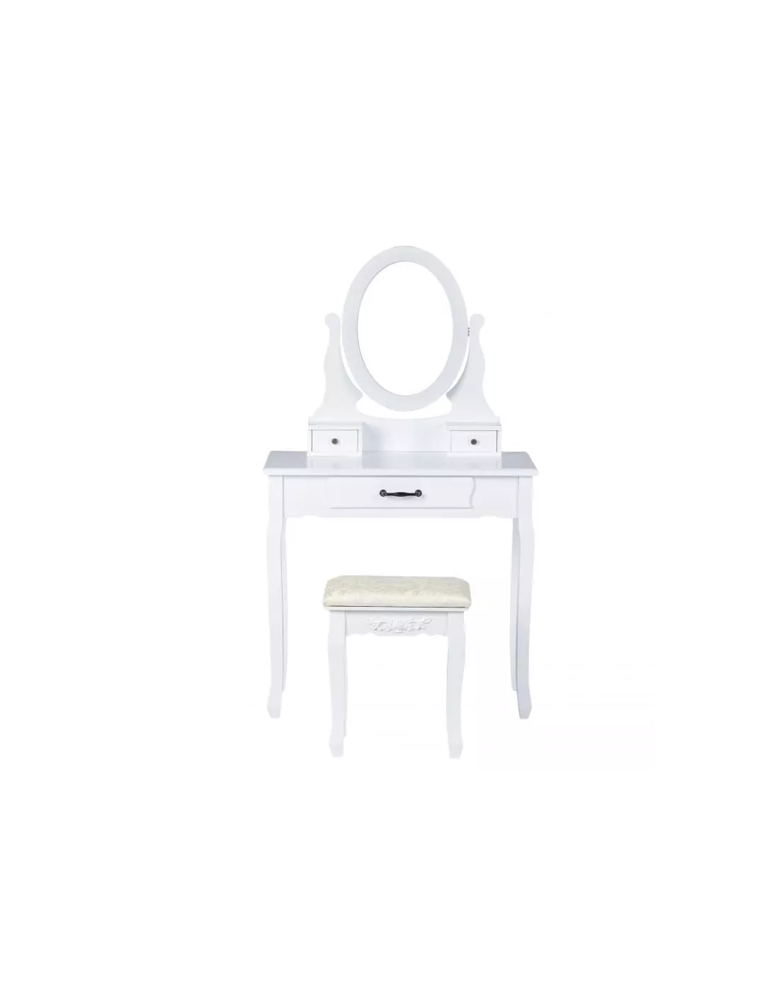 Toaletka kosmetyczna, konsola Estella to zaprojektowany specjalnie z myślą o kobietach piękny, stylowy mebel. Utrzymany w stylistyce vintage posiada ozdobne ornamenty, zaokrąglenia i wyżłobienia. Estella posiada łącznie, 3 szufladki, które z powodzeniem pomieszczą się kosmetyki i akcesoria. Niebanalny design sprawia, że ta toaletka poza swoją pierwotną funkcją może służyć również jako element wystroju wnętrza. Ta konsola posiada duże uchylne, owalne lustro po środku a także dużą szufladę. W skład zestawu wchodzi również tapicerowane krzesełko - stołek, którego siedzisko zostało poszyte pięknym, kobiecym materiałem.