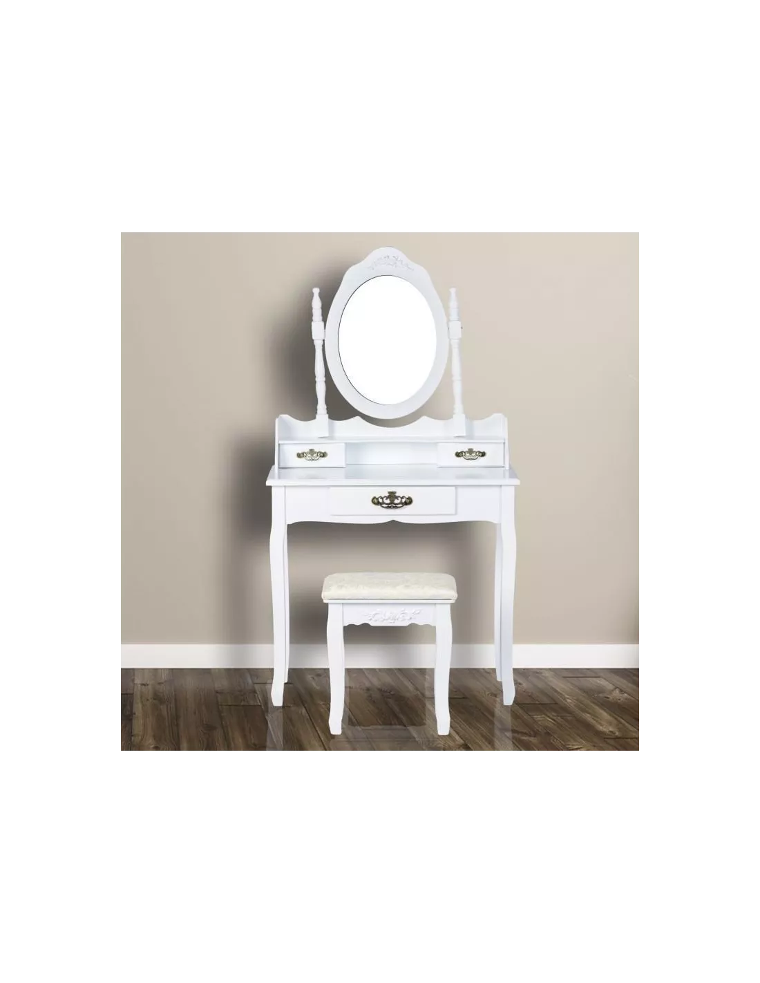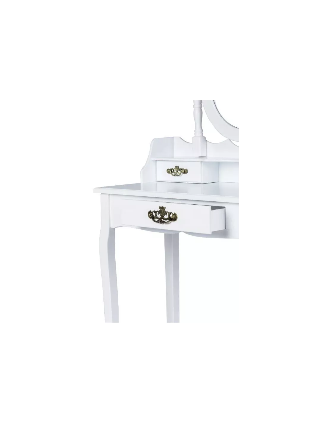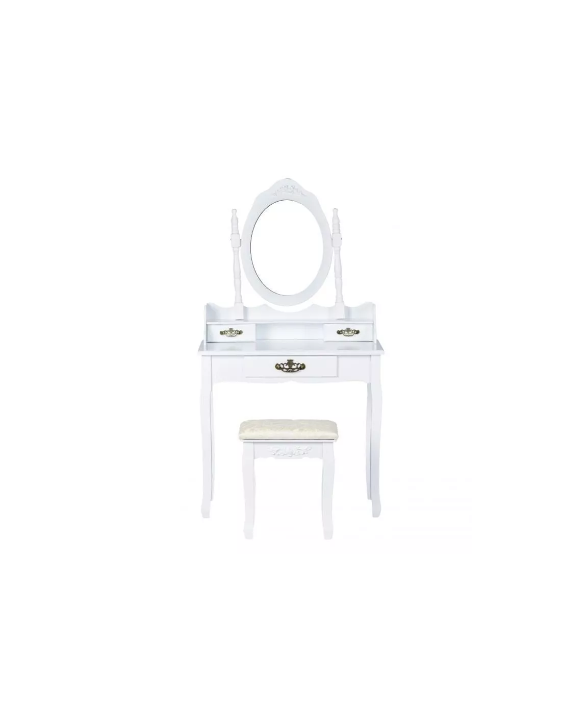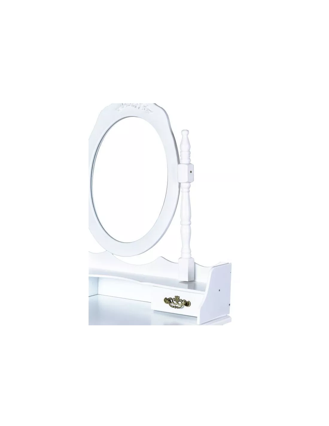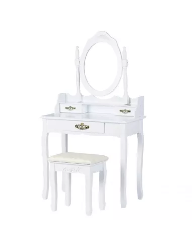 Toaletka kosmetyczna, konsola Ludwika to zaprojektowany specjalnie z myślą o kobietach piękny, stylowy mebel. Utrzymany w stylistyce francuskiej, posiada ozdobne ornamenty w kolorze złotym, które pięknie się prezentują na białym tle. Ludwika posiada łącznie, 3 szufladki, które z powodzeniem pomieszczą się kosmetyki i akcesoria. Dwie mniejsze na blacie i jedną większą, wysuwaną z blatu. Niebanalny design sprawia, że ta toaletka poza swoją pierwotną funkcją może służyć również jako element wystroju wnętrza. Ta konsola posiada duże uchylne, owalne lustro po środku, które daje czyste odbicie bez zniekształceń. W skład zestawu wchodzi również tapicerowane krzesełko - stołek, którego siedzisko zostało poszyte pięknym, kobiecym materiałem.