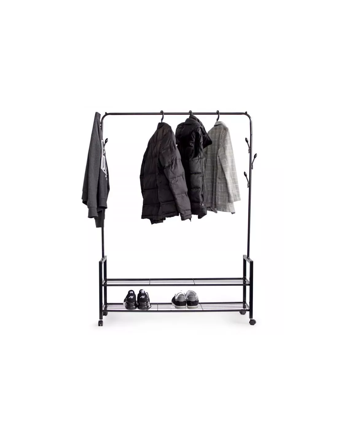Wieszak stojący na kółkach Sila to propozycja dla miłośników minimalistycznych wnętrz i skandynawskiego klimatu. Dzięki utrzymaniu w uniwersalnej, czarnej kolorystyce, mebel pozwala na uzyskanie bardzo modnego i jednocześnie klasycznego wieszaka - mini garderoby. Sila to mobilna garderoba, która umożliwi Ci nieograniczony dostęp do odzieży w dowolnej chwili. Posiada łącznie 7 haków na ubrania w wieszaku pionowym oraz drążek poziomy na wieszaki. Dodatkowo, mebel wyposażony jest w dwie półki na obuwie. Całość konstrukcji posiada solidną i dobrze dopasowaną podstawę, ale dzięki mobilnym kółkom pozwala na komfortowe przewożenie z miejsca na miejsce. Sila to gwarancja solidności i stabilności - mebel wykonany został ze stali malowanej proszkowo na kolor czarny. Utrzymanie w minimalistycznym stylu sprawia, że idealnie pasuje do każdego pomieszczenia. To rozwiązanie zarówno do sypialni, jak i garderoby.