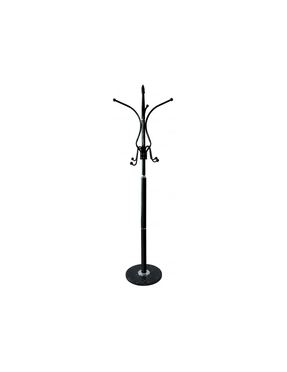 Stojący wieszak obrotowy to wolnostojący mebel przeznaczony do przedpokojów, holi, korytarzy. Dzięki szerokiej, ciężkiej marmurowej podstawie (37 cm) wieszak nie chwieje się i nie przewraca. Wieszak wyposażony w 9 solidnych wieszaków (dwupoziomowych) na odzież. Dzięki takiej liczbie wieszaków można na nim powiesić naprawdę dużo odzieży, kapeluszy, parasolek. Ten wieszak do przedpokoju prezentuje się bardzo elegancko, posiada ozdobne wykończenia. Jest wykonany bardzo starannie z dbałością o szczegóły, zakończenia haków stanowią ozdobne kule, będące jednocześnie zabezpieczeniem. Wieszak posiada marmurową podstawę co gwarantuje jego stabilność i wygodę użytkowania. Świetnie sprawdzi się również w lokalach usługowych jak kawiarnie czy restauracje, będąc przy tym istotnym elementem wystroju wnętrza. Czarny kolor świetnie wpasuje się w większość modnych aranżacji.