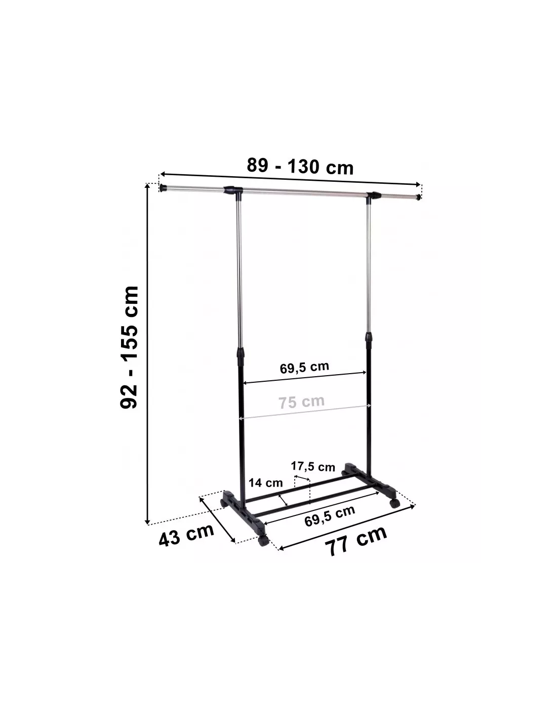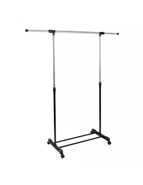 Praktyczny i wytrzymały wieszak garderobiany na kółkach. Wieszak sprawdzi się w każdym domu i w biurze, w którym brakuje miejsca do powieszenia odzieży. Nasz produkt został wyposażony w pojedynczy chromowany drążek, który pomieści dużo odzieży. Dodatkowym atutem wieszaka jest wytrzymała i zaskakująco pojemna półka na buty, oraz nakładki na końce drążka uniemożliwiające zsunięcie się odzieży. Montaż wieszaka jest niezwykle prosty i nie wymaga użycia narzędzi.