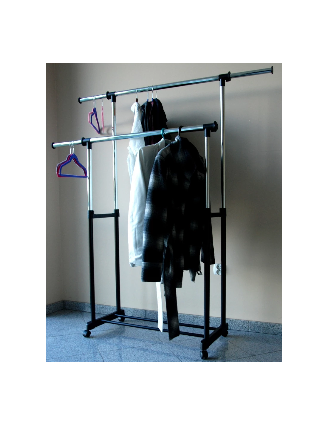 Wieszak sprawdzi się w każdym domu i w biurze, w którym brakuje miejsca do powieszenia odzieży. Nasz produkt został wyposażony w podwójny chromowany drążek z wyjątkowo grubych rurek. Dodatkowym atutem wieszaka jest wytrzymała i zaskakująco pojemna półka na buty, oraz nakładki na końce drążka uniemożliwiające zsunięcie się odzieży. Montaż wieszaka jest niezwykle prosty i nie wymaga użycia narzędzi. Posiada regulację wysokości i szerokości.