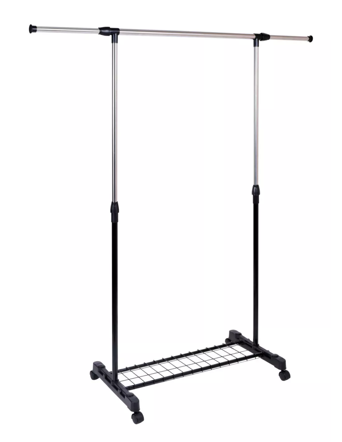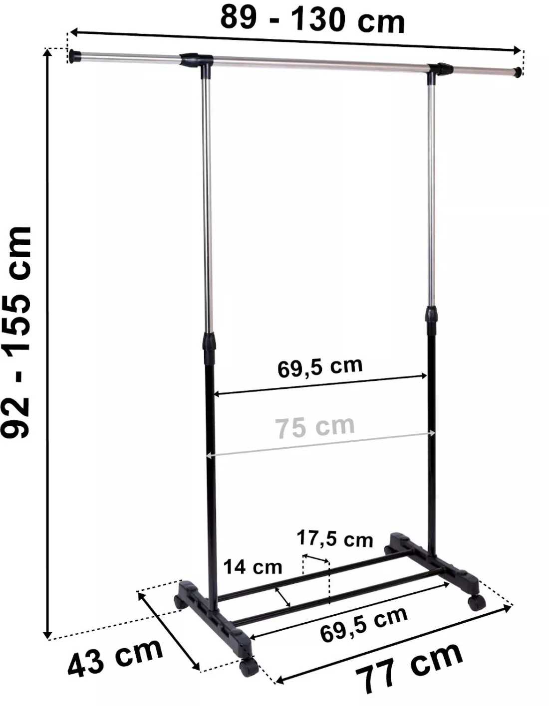 Wieszak metalowy na kółkach Luki - to mobilna garderoba, która idealnie odnajdzie się wszędzie, gdzie potrzebny jest zgrabny wieszak na ubrania. Zastosowanie znajdzie w loftowej sypialni, w podróży, na backstage, zapleczu, poczekalni, biurze itd... Jest świetną alternatywą dla klasycznego wieszaka - posiada kółka, dzięki którym szybko przemieścisz ją z miejsca na miejsce a także regulację szerokości i wysokości wieszaka, dzięki czemu dopasujesz ją do swoich potrzeb. Dodatkowym atutem mobilnej garderoby jest półka na obuwie (kratka). Metalowa garderoba wykonana ze stali malowanej proszkowo i tworzywa sztucznego. Solidna, wzmacniana konstrukcja, zabezpieczenia przed zsunięciem ubrań/wieszaków.