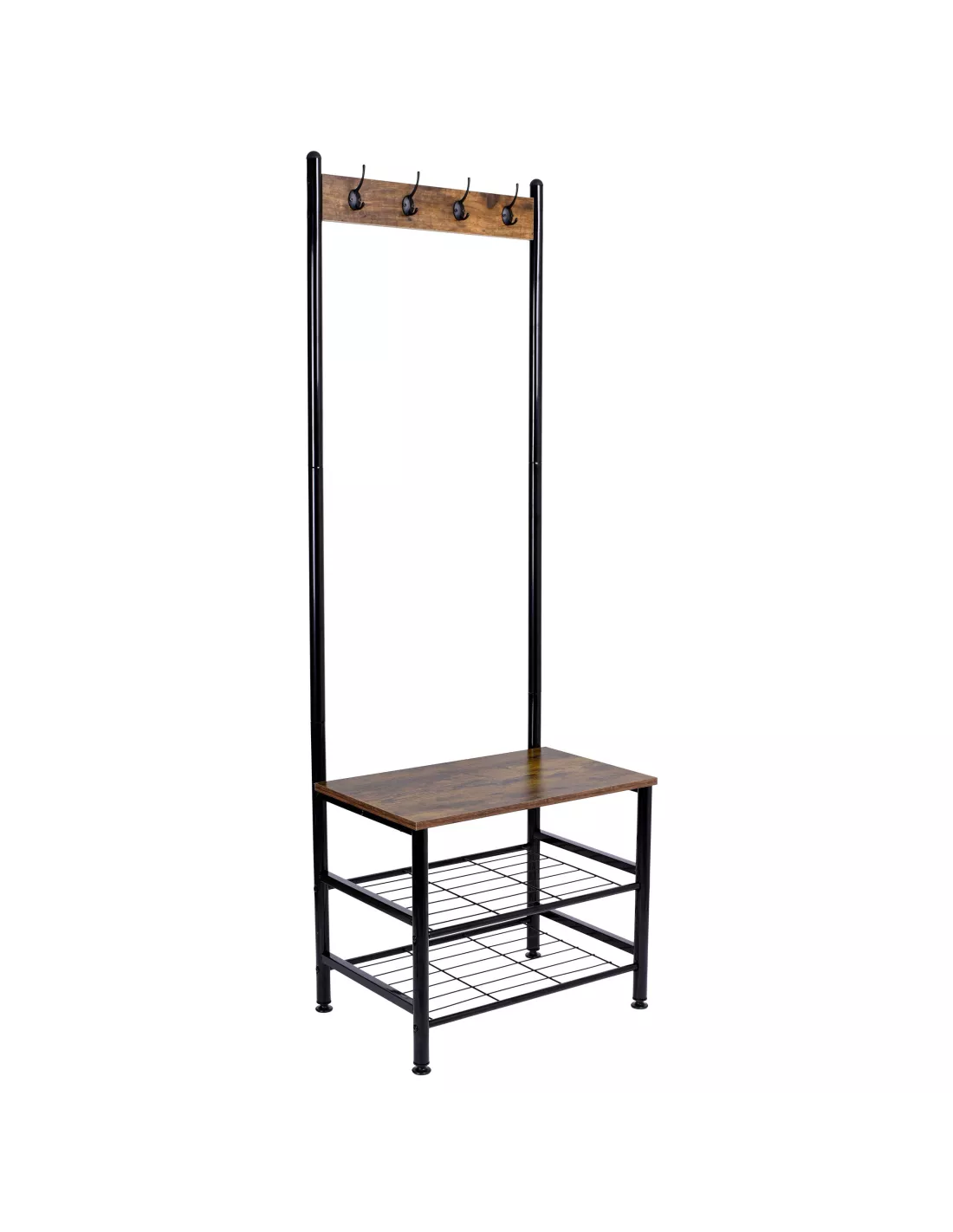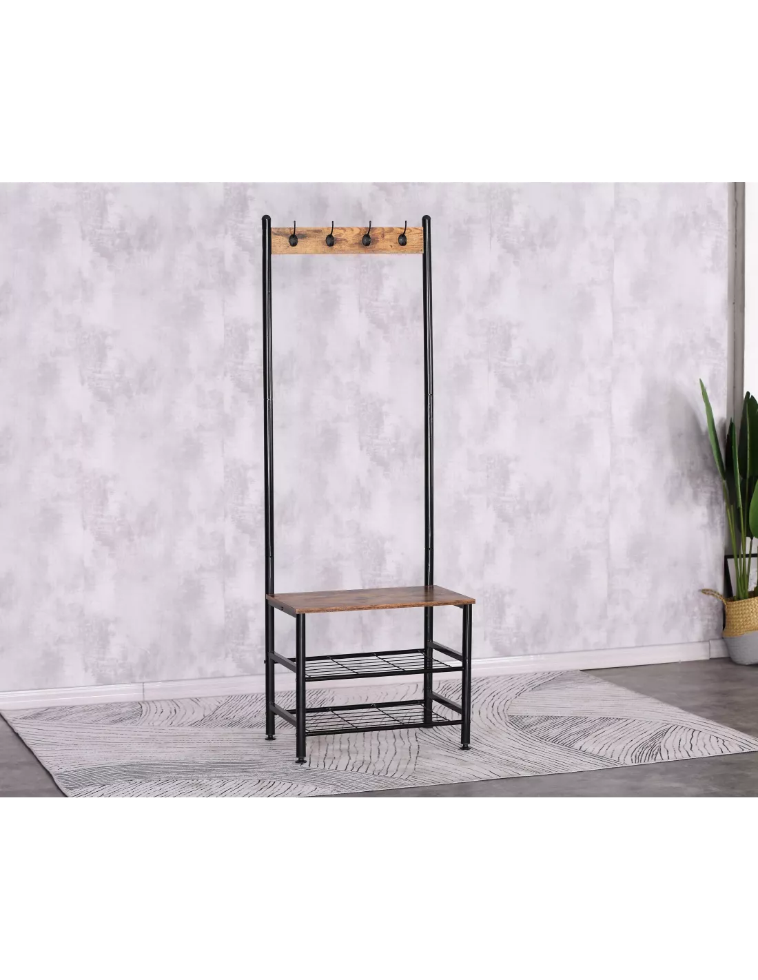 Wieszak stojący na ubrania Bergen to propozycja dla miłośników minimalistycznych wnętrz i industrialnego klimatu. Mebel pozwala na uzyskanie bardzo modnego i jednocześnie klasycznego wieszaka - mini garderoby. Bergen to garderoba, która umożliwi Ci nieograniczony dostęp do odzieży w dowolnej chwili. Posiada 4 podwójne haki na ubrania: kurtki, płaszcze, marynarki. Dodatkowo, mebel wyposażony jest w 2 półki na obuwie czy pudełka oraz półkę - blat z płyty laminowanej, na której można siadać i korzystać jak z ławeczki, co znacznie ułatwi zmianę obuwia. Całość konstrukcji posiada solidną i dobrze dopasowaną podstawę, to gwarancja solidności i stabilności - mebel wykonany został ze stali malowanej proszkowo. Utrzymanie w minimalistycznym stylu sprawia, że idealnie pasuje do każdego pomieszczenia. To rozwiązanie zarówno do sypialni, jak i garderoby czy przedpokoju.