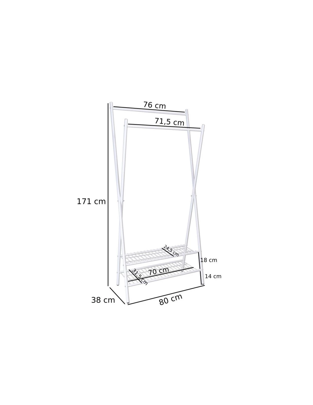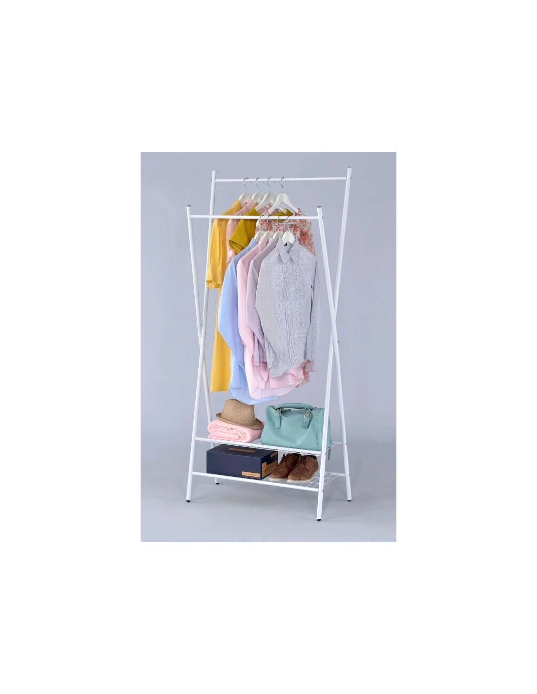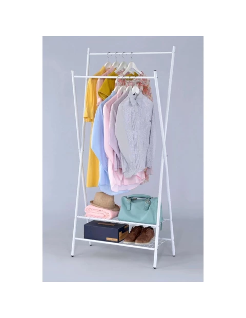 Prezentowany model charakteryzuje się przede wszystkim odpowiednią uniwersalnością. Pozwala z powodzeniem na zastosowanie zarówno w przedpokoju, sypialni, w biurze, jak i w podróży. Wieszak Xavier to przenośny metalowy mebel, posiadający dwa pręty, dzięki którym można skutecznie wieszać na nim ubrania różnej wielkości, jak i dwie funkcjonalne półki. Wieszak wyposażony jest w prążkowane pręty, dzięki czemu jest również odpowiednio bezpieczny. Świetnie prezentuje się w każdej stylistyce pomieszczenia, niezależnie od estetyki. Dzieje się tak dzięki uniwersalności w wyglądzie, jak i prostocie w funkcjonowaniu. Bardzo łatwy montaż oraz estetyczny wygląd sprawiają, że ta oryginalna i minimalistyczna, biała garderoba zyskała ostatnimi czasy bardzo dużą popularność. Polecana jest przede wszystkim do prostych i minimalistycznych pomieszczeń, ale również z łatwością można ją przenosić i transportować.