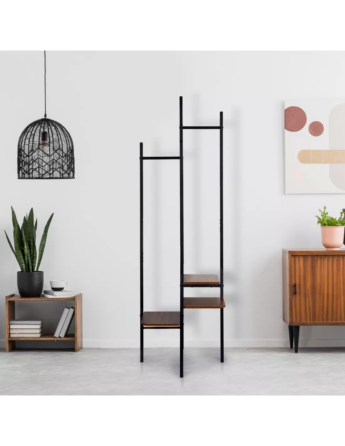 Estetyczny wieszak, który jednocześnie będzie Twoją szafą i garderobą? Ten model sprawdzi się idealnie! Posiada 5 pionowych rurek, na szczycie których można swobodnie odwieszać kurtki czy płaszcze. Ponadto, 4 funkcjonalne drążki, na których zmieści się kilkanaście wieszaków z koszulami i sukienkami. Do tego 4 ciekawie rozmieszczone półki, gdzie z powodzeniem odłożysz torby, buty czy inne ubrania. Jeden filigranowy mebel - wiele możliwości i rozwiązań. Dołóżmy do tego ciekawy loftowy design, i zyskujemy modny mebel do każdego przedpokoju ale i sypialni. Będzie on doskonałym uzupełnieniem wystroju wnętrz, zwłaszcza tych o surowej industrialnej stylistyce.