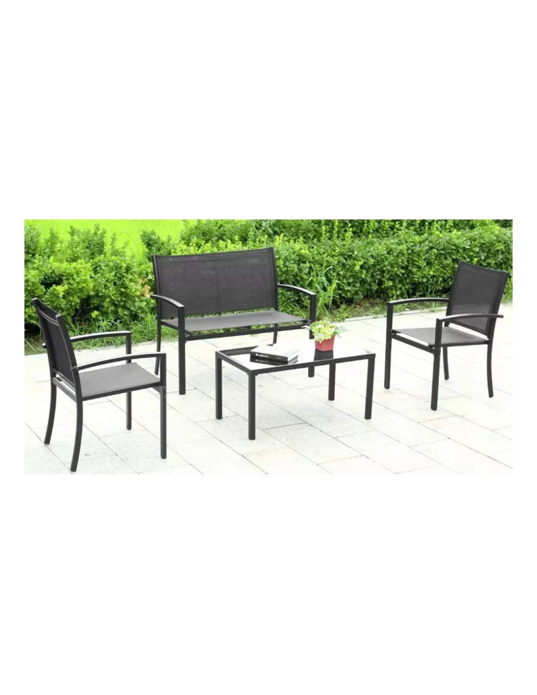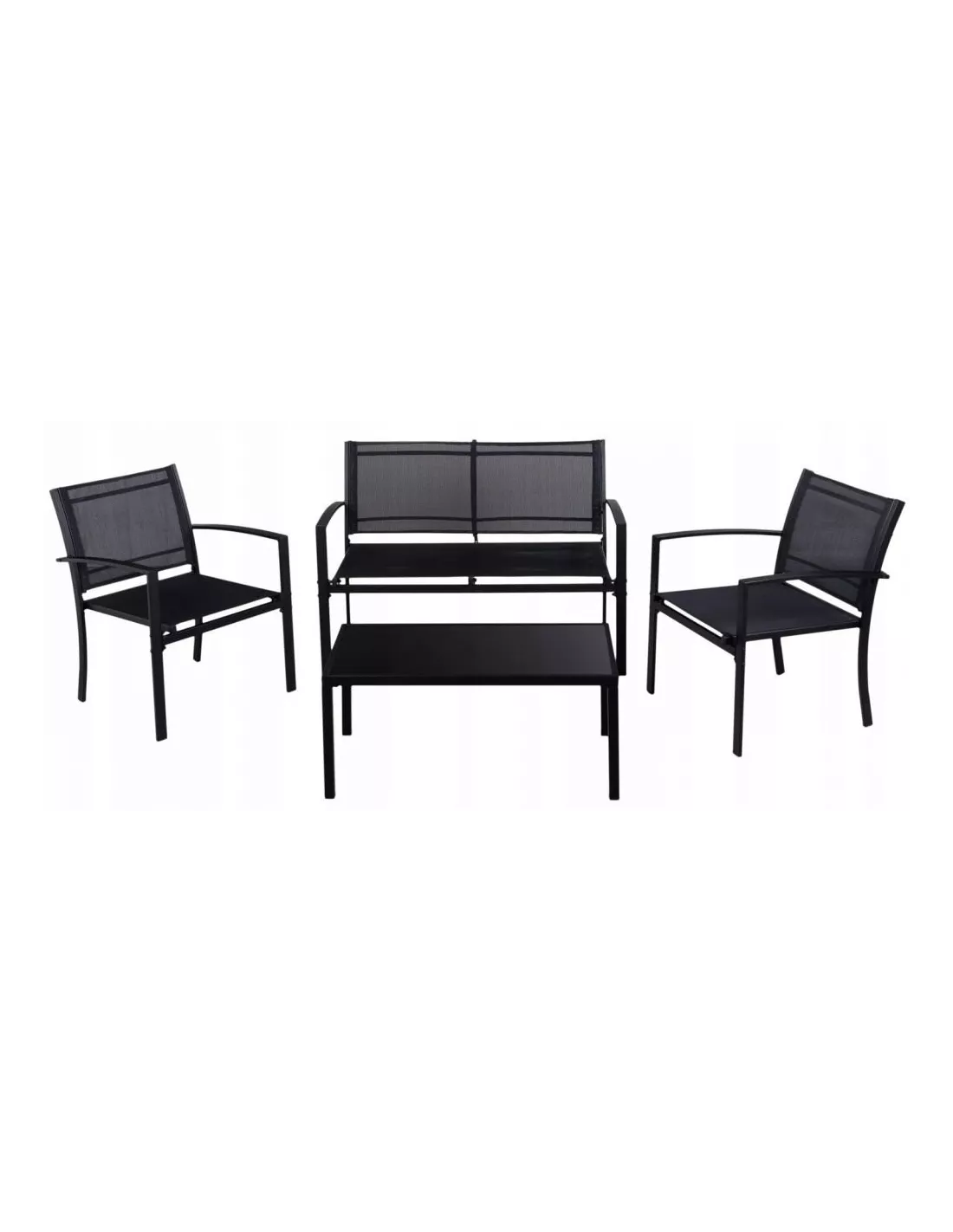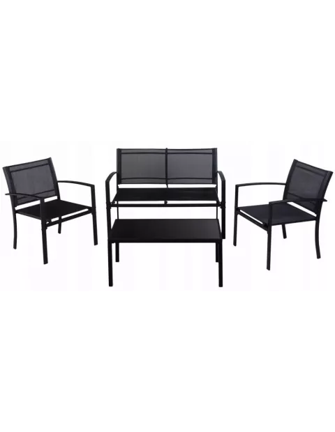 Idealny na ciepłe wieczory i poranki spędzane na zewnątrz zestaw mebli ogrodowych Garden. W skład zestawu wchodzą 2 krzesła, ławka i stolik kawowy. Meble wykonane zostały z metalu, malowanego proszkowo na kolor czarny. Solidna i stabilna konstrukcja gwarantuje długie i bezpieczne użytkowanie. Do siedzisk użyto przepuszczalnej, mocnej tkaniny, która nie dość, że ładnie się prezentuje - to jest bardzo łatwa w czyszczeniu. Dzięki zastosowaniu najlepszych materiałów ten zestaw mebli ogrodowych jest całkowicie odporny na opady czy UV. Meble są bardzo łatwe w montażu a dzięki niewielkiej wadze - także w przechowywaniu. Zestaw Garden to miejsce do odpoczynku w zaciszu domowego ogrodu dla 4 osób.
