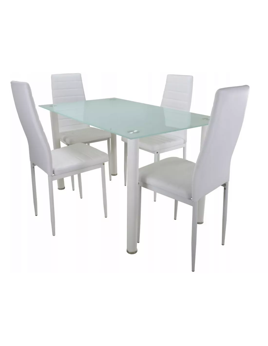 Zestaw stołowy White to idealna propozycja do każdej kuchni lub jadalni oraz lokalów usługowych typu restauracje czy kawiarnie. W skład zestawu wchodzi szklany biały stół z solidnym, hartowanym blatem i metalowym stelażem oraz 4 krzesła o białym metalowym stelażu i siedziskach z eko-skóry. Ilość kolorów tapicerki - pozwala dobrać ten pasujący do danego wnętrza. Krzesła posiadają ozdobne, poziome przeszycia, tworzące na siedzisku wzór pasów. Wyprofilowane oparcie i miękkie siedzisko, gwarantują Tobie i Twojej rodzinie wygodę siedzenia. Zamów już dzisiaj i zyskaj piękne, przytulne miejsce do długich wieczornych pogadanek i wspólnego spożywania posiłków.